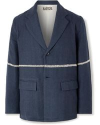 Go to SenserBasket-weave blazer with peaked lapels, a double-breasted front, welt pockets at the chest, flap pockets, padded shoulders, four-button surgeon's cuffs, a vented back hem, internal welt pockets, and a full satin lining. Color: blue