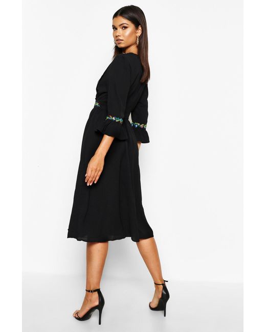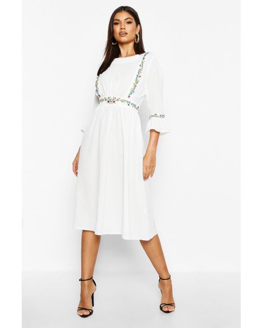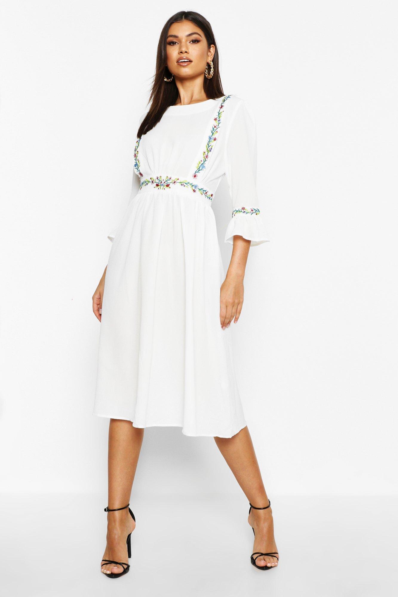 Womens Embroidered Ruffle Sleeve Midi Dress - white - 4 - Dresses are the most-wanted closet item for day-to-night dressing. From cool-tone whites to block brights, we've got the everyday skater dresses and party-ready bodycon styles that are perfect for transitioning from day to play. Minis, midis and maxis are our motto, with classic jersey always genius and printed cami dresses the season's killer cut - add skyscraper heels for a serioulsy statement look. Dress up or down in style with boohoo. Color: white