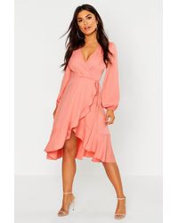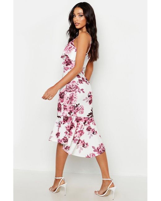 Womens Floral Wrap Ruffle Midi Dress - pink - 4 - Dresses are the most-wanted closet item for day-to-night dressing. From cool-tone whites to block brights, we've got the everyday skater dresses and party-ready bodycon styles that are perfect for transitioning from day to play. Minis, midis and maxis are our motto, with classic jersey always genius and printed cami dresses the season's killer cut - add skyscraper heels for a serioulsy statement look. Dress up or down in style with boohoo. Color: pink