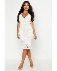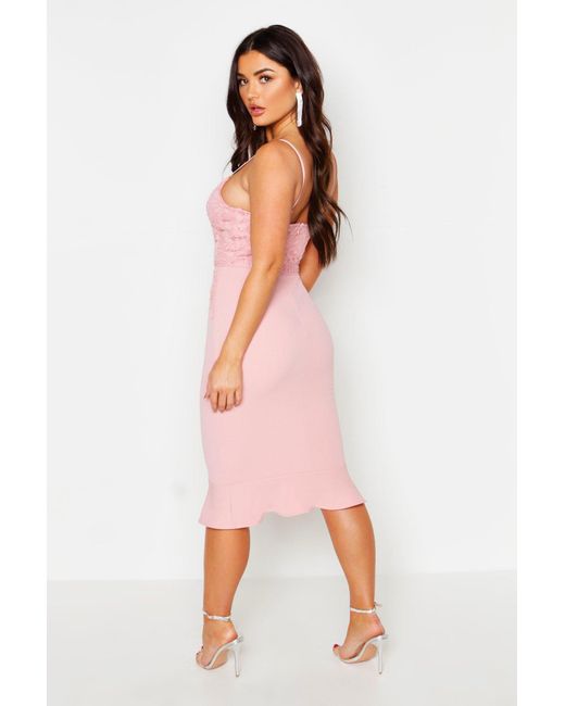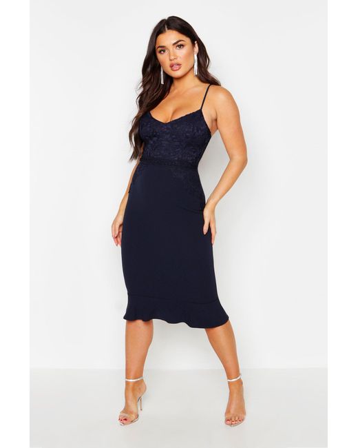 Womens Lace Panel Ruffle Hem Midi Dress - navy - 4 - Dresses are the most-wanted closet item for day-to-night dressing. From cool-tone whites to block brights, we've got the everyday skater dresses and party-ready bodycon styles that are perfect for transitioning from day to play. Minis, midis and maxis are our motto, with classic jersey always genius and printed cami dresses the season's killer cut - add skyscraper heels for a serioulsy statement look. Dress up or down in style with boohoo. Color: blue