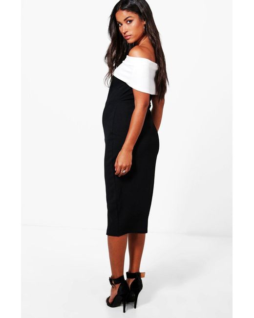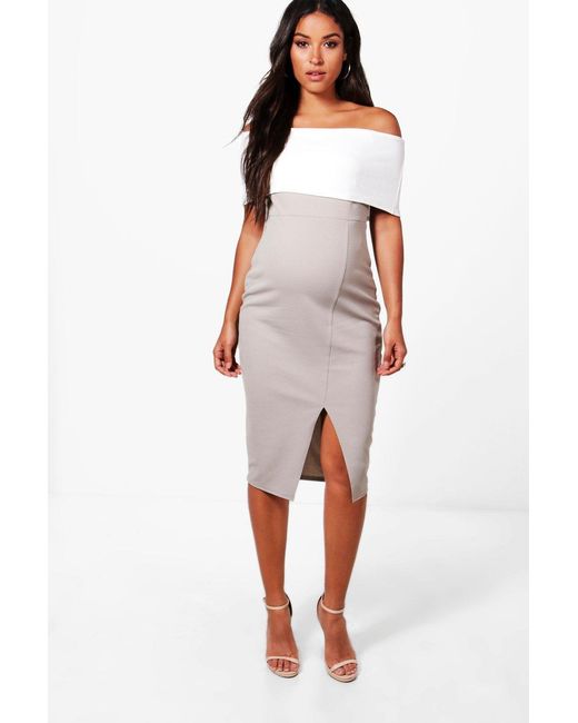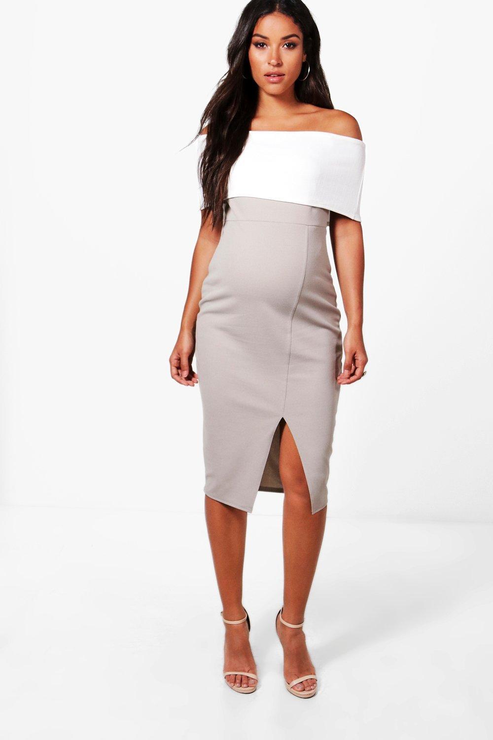 Womens Maternity Contrast Off The Shoulder Midi Dress - grey - 4 - Be seriously on trend this season with your hem line and add a midi dress to your wardrobe. The midi dress offers cool, transitional dressing with serious layer ability. Whether you go for a floral wrap design teamed with Sneakers or a bodycon fit with killer heels, go midi to add that extra edge to any outfit.