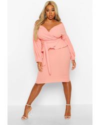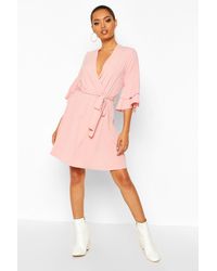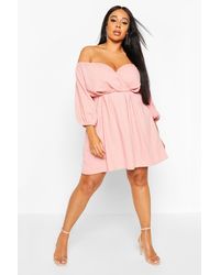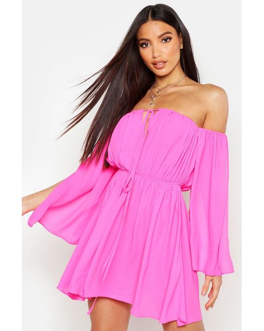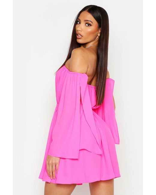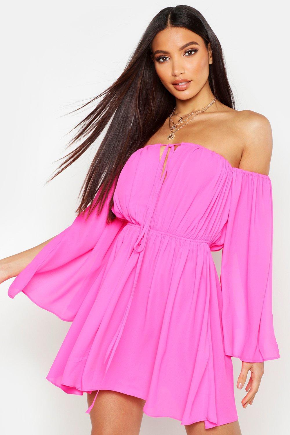 Womens Off The Shoulder Flare Sleeve Dress - Pink - 4 - Dresses are the most-wanted closet item for day-to-night dressing. From cool-tone whites to block brights, we've got the everyday skater dresses and party-ready bodycon styles that are perfect for transitioning from day to play. Minis, midis and maxis are our motto, with classic jersey always genius and printed cami dresses the season's killer cut - add skyscraper heels for a serioulsy statement look. Dress up or down in style with boohoo. Color: pink