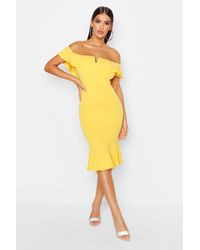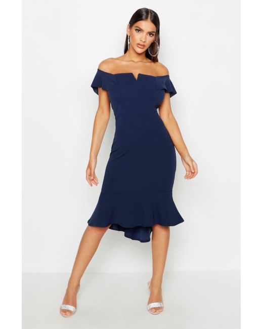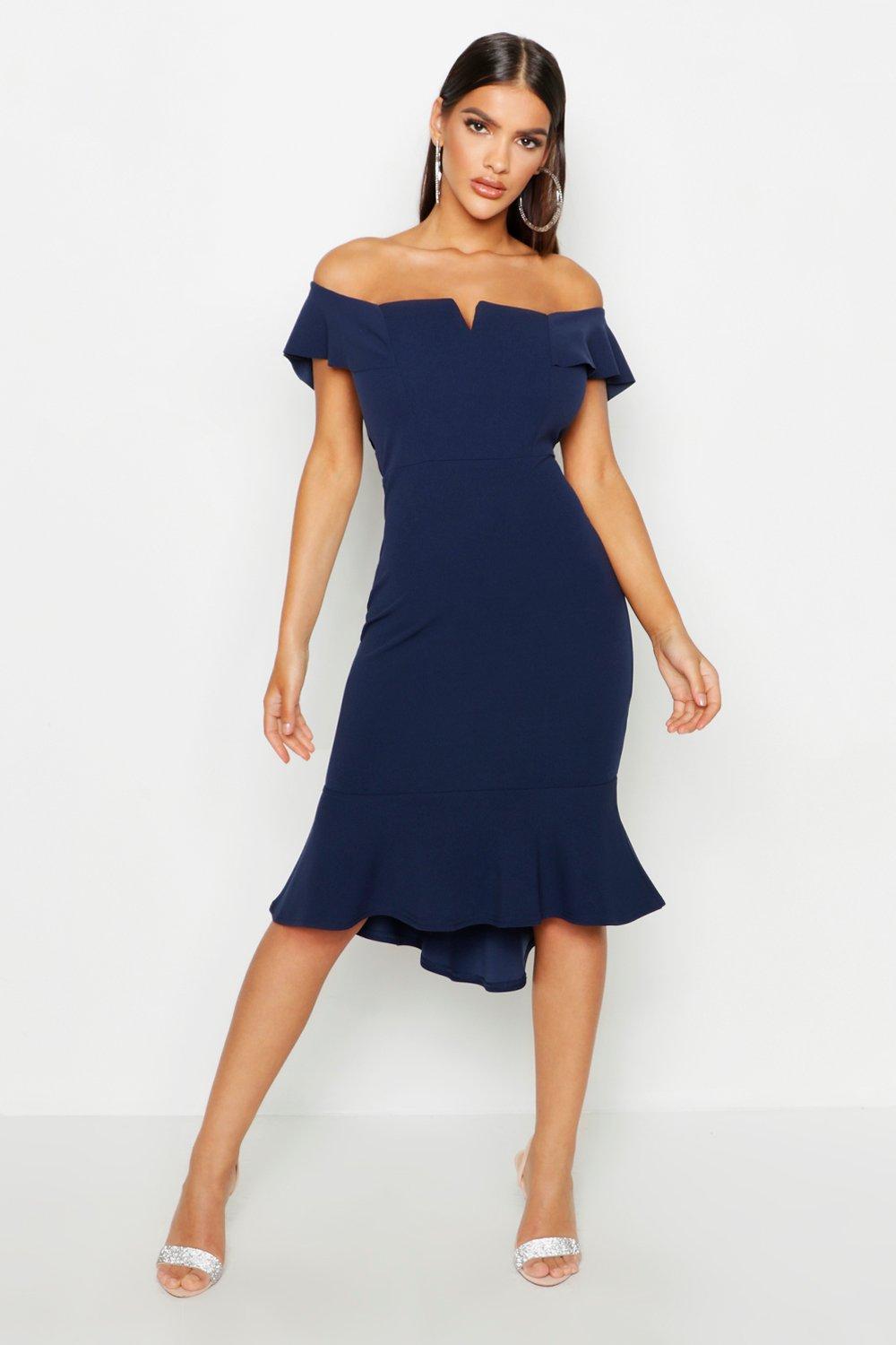Womens Off The Shoulder V Bar Ruffle Hem Midi Dress - navy - 4 - Dresses are the most-wanted closet item for day-to-night dressing. From cool-tone whites to block brights, we've got the everyday skater dresses and party-ready bodycon styles that are perfect for transitioning from day to play. Minis, midis and maxis are our motto, with classic jersey always genius and printed cami dresses the season's killer cut - add skyscraper heels for a serioulsy statement look. Dress up or down in style with boohoo. Color: blue