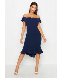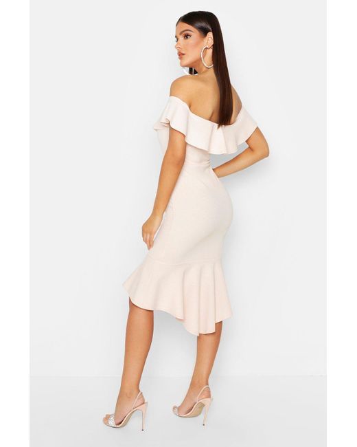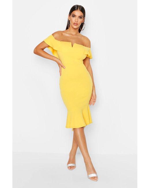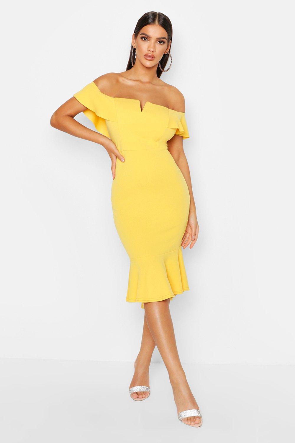Womens Off The Shoulder V Bar Ruffle Hem Midi Dress - yellow - 4 - Dresses are the most-wanted closet item for day-to-night dressing. From cool-tone whites to block brights, we've got the everyday skater dresses and party-ready bodycon styles that are perfect for transitioning from day to play. Minis, midis and maxis are our motto, with classic jersey always genius and printed cami dresses the season's killer cut - add skyscraper heels for a serioulsy statement look. Dress up or down in style with boohoo. Color: yellow