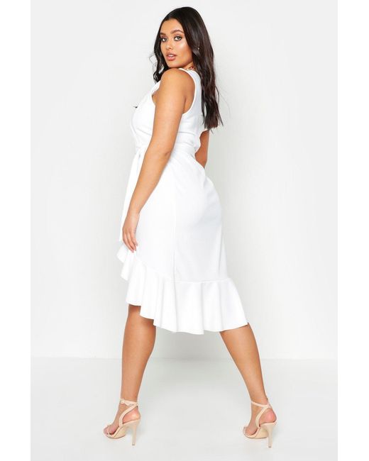 Womens Plus Asymmetric Belted Ruffle Hem Midi Dress - white - 12 - Dresses are the most-wanted closet item for day-to-night dressing. From cool-tone whites to block brights, we've got the everyday skater dresses and party-ready bodycon styles that are perfect for transitioning from day to play. Minis, midis and maxis are our motto, with classic jersey always genius and printed cami dresses the season's killer cut - add skyscraper heels for a serioulsy statement look. Dress up or down in style with boohoo. Color: white