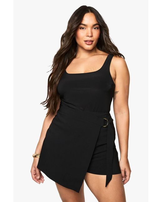 Womens Plus Wrap Buckle Skort - Black - 24 - Stylish wrap-front skort design combining the look of a skirt with the practicality of shorts Sleek square neckline and flattering thick straps for comfortable support Distinctive buckle detail adds contemporary edge to this versatile piece Asymmetric wrap overlay creates a flattering silhouette Bengaline fabric offers a smooth finish with gentle stretch for comfort and movement Make a statement on your next night out with these fashion-forward wrap skorts. The clever design combines shorts with an asymmetric overlay for a look that's both practical and chic. The square neckline frames your dcolletage beautifully, while the buckle detail adds interest to the wrap design. Style with strappy heels and statement jewelry for drinks with the girls, or dress down with chunky Sneakers and an oversized blazer for casual drinks. The versatile design transitions effortlessly from day to night - simply switch up your accessories to suit the occasion. Perfect for dancing the night away with the confidence of shorts but the elegance of a skirt. Color: black