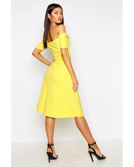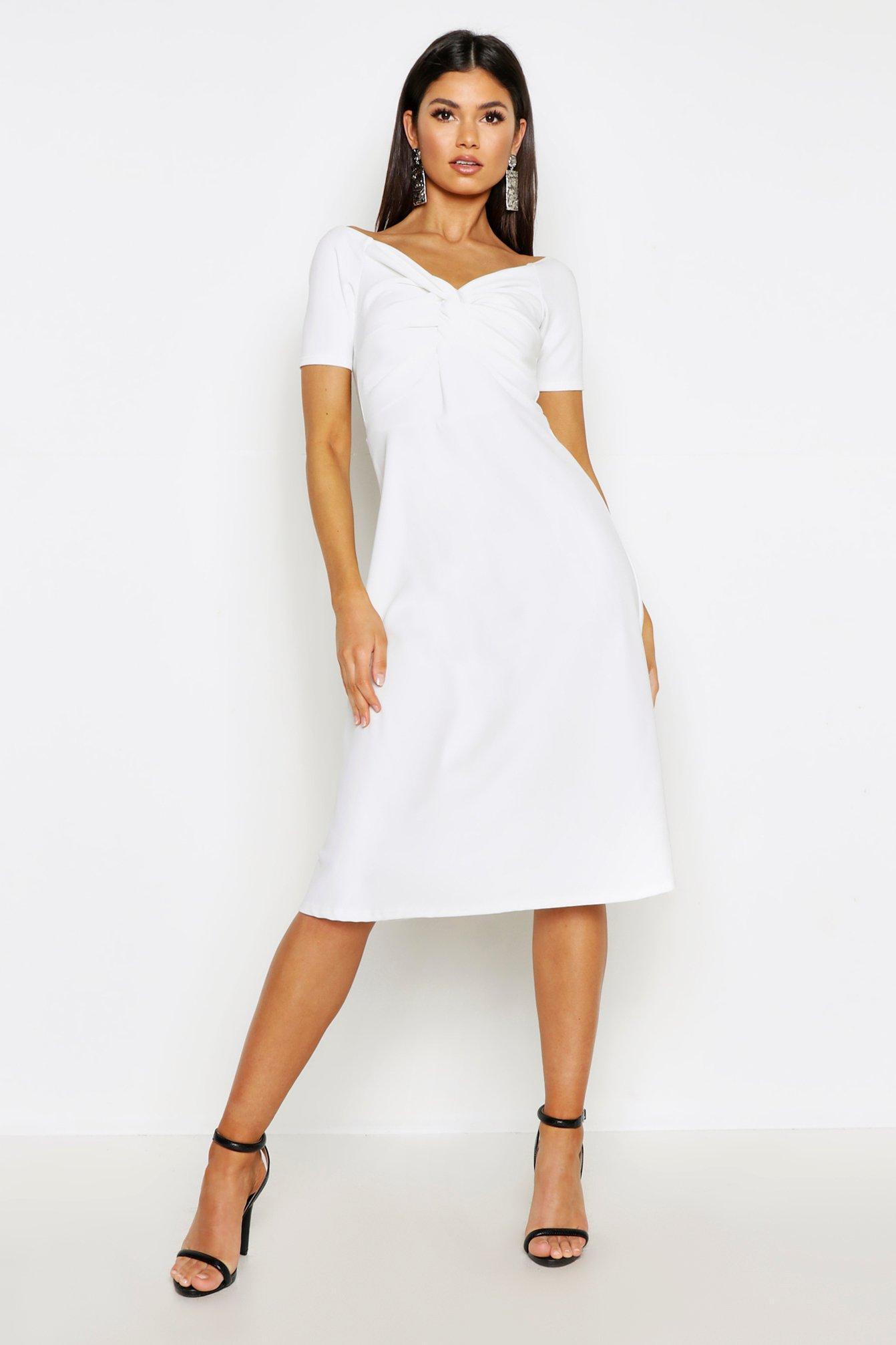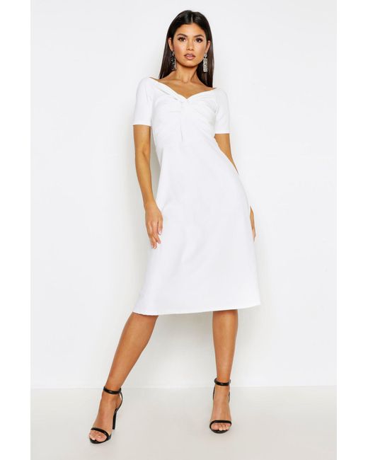 Womens Twist Bardot Midi Skater Dress - white - 2 - Dresses are the most-wanted closet item for day-to-night dressing. From cool-tone whites to block brights, we've got the everyday skater dresses and party-ready bodycon styles that are perfect for transitioning from day to play. Minis, midis and maxis are our motto, with classic jersey always genius and printed cami dresses the season's killer cut - add skyscraper heels for a serioulsy statement look. Dress up or down in style with boohoo. Color: white