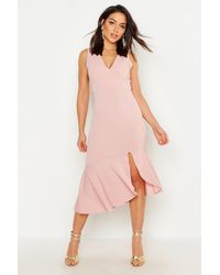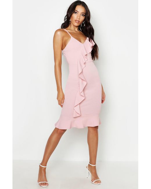 Womens V Neck Ruffle Front Hem Midi Dress - pink - 2 - Dresses are the most-wanted closet item for day-to-night dressing. From cool-tone whites to block brights, we've got the everyday skater dresses and party-ready bodycon styles that are perfect for transitioning from day to play. Minis, midis and maxis are our motto, with classic jersey always genius and printed cami dresses the season's killer cut - add skyscraper heels for a serioulsy statement look. Dress up or down in style with boohoo. Color: pink