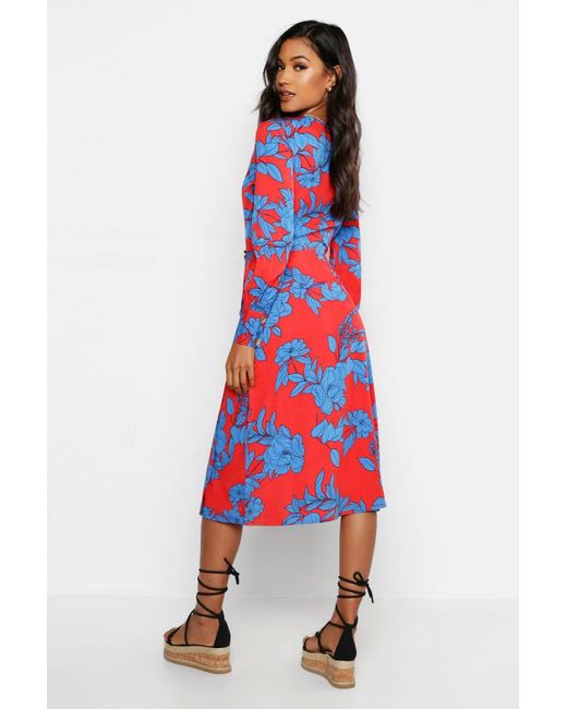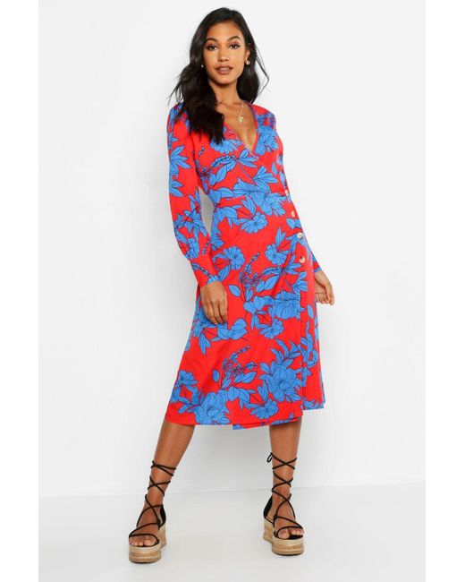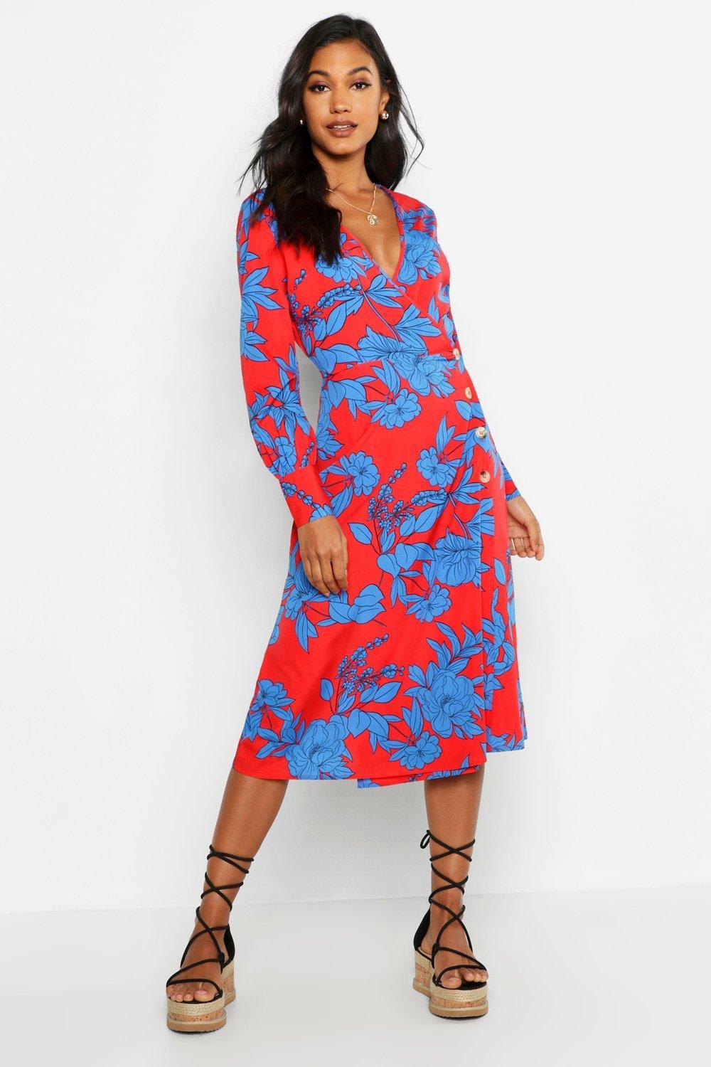 Womens Wrap Front Button Detail Midi Dress - red - 6 - Dresses are the most-wanted closet item for day-to-night dressing. From cool-tone whites to block brights, we've got the everyday skater dresses and party-ready bodycon styles that are perfect for transitioning from day to play. Minis, midis and maxis are our motto, with classic jersey always genius and printed cami dresses the season's killer cut - add skyscraper heels for a serioulsy statement look. Dress up or down in style with boohoo. Color: red