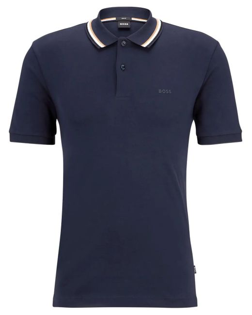 Men's Blue Logo-Print Striped-Trim Cotton Polo Shirt