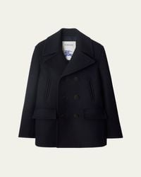 Go to BurberryA classic pea coat crafted from wool and cashmere with a smooth leather undercollar. Inspired by heritage designs, the coat features an oversize martingale, wide collar revere and epaulettes. Jet and flap pockets