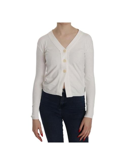 Introducing the Byblos White V-neck Cropped Cardigan Blouse, a stylish addition to your closet. This feminine cardigan features a flattering V-neckline and long sleeves, perfect for layering during the cooler months. The button closure adds a touch of elegance, while the logo details showcase the brand`s signature style. Crafted from a blend of 53% Polyamide and 47% Viscose, this cardigan offers both comfort and durability. Embrace timeless elegance with this Byblos cardigan, designed exclusively for women. Color: gray