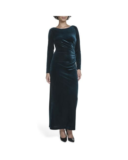 Women's Blue Long Sleeve Round Neck Velvet Straight Maxi Dress