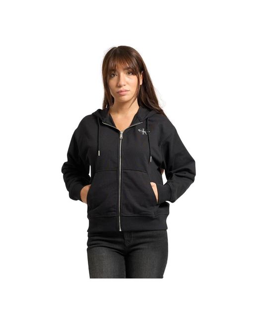 Stay stylish and comfortable in this Calvin Klein women's zip-through hoodie made from a cotton-polyester blend terry fabric. Featuring rib-knit cuffs and hem, and the iconic Calvin Klein monogram logo on the chest. Model is wearing size S and is 165cm tall. Color: black