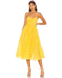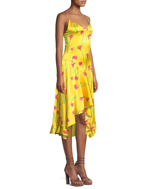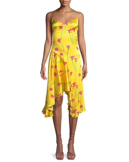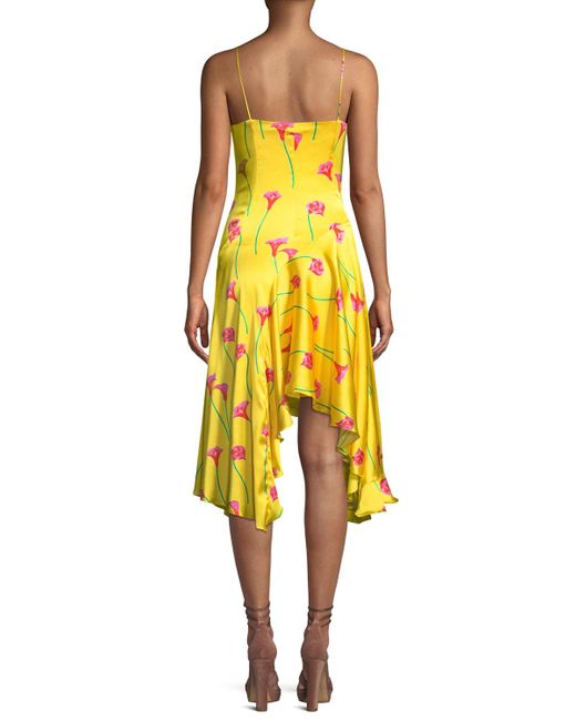 Caroline Constas "Marie" dress featuring calla lily print. V neckline. Spaghetti straps. A-line silhouette. Asymmetric flounce hem. Midi length. Side zip closure. Silk/spandex. Made in the USA. Color: yellow