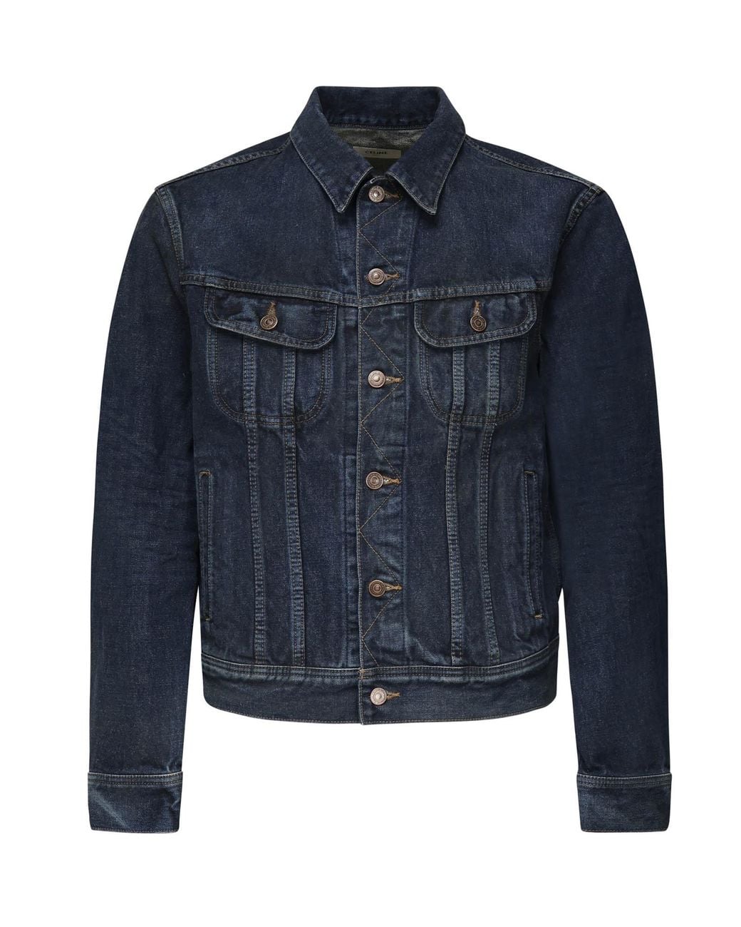 Dark indigo denim jacket with a spread collar and single-breasted button-through front closure featuring antique brass-tone riveted buttons. Two chest patch pockets with button flap closures and two lower side welt pockets. Contrast topstitching throughout. Back panel features large cream-colored embroidered or flocked CELINE PARIS lettering in a decorative font. Adjustable button tabs at the back hem. Single-button cuffs. Color: blue