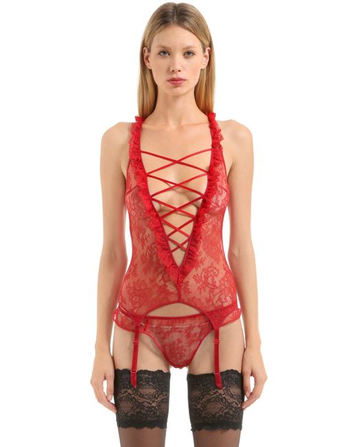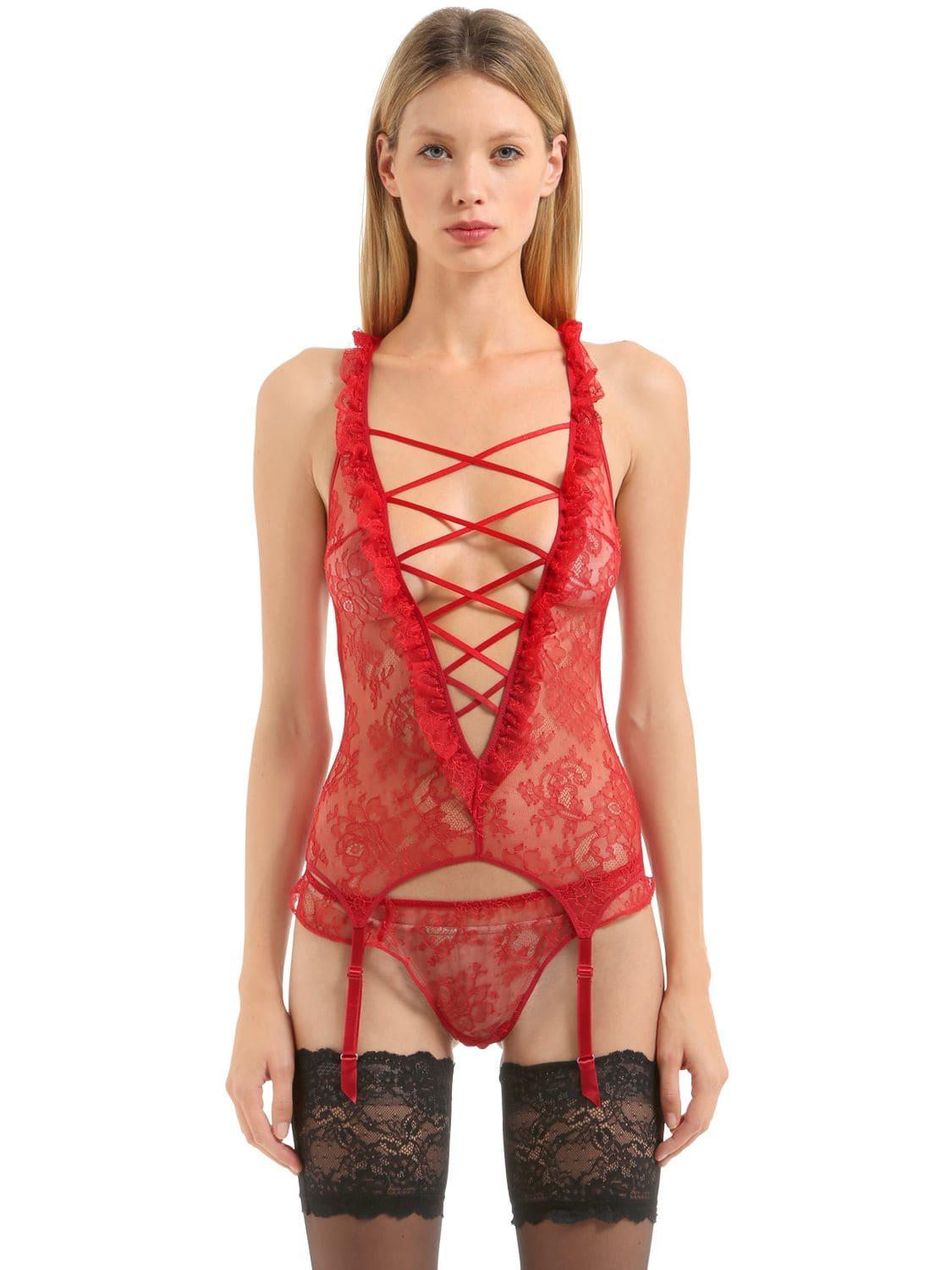 Non-detachable shoulder straps. Flexible corset with racerback design. Lace ruffles. Pa,pl,ea. Color: red