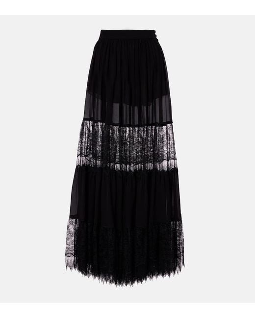 Lace-Trimmed Tiered Silk Maxi Skirt