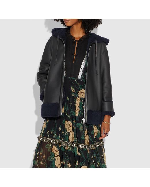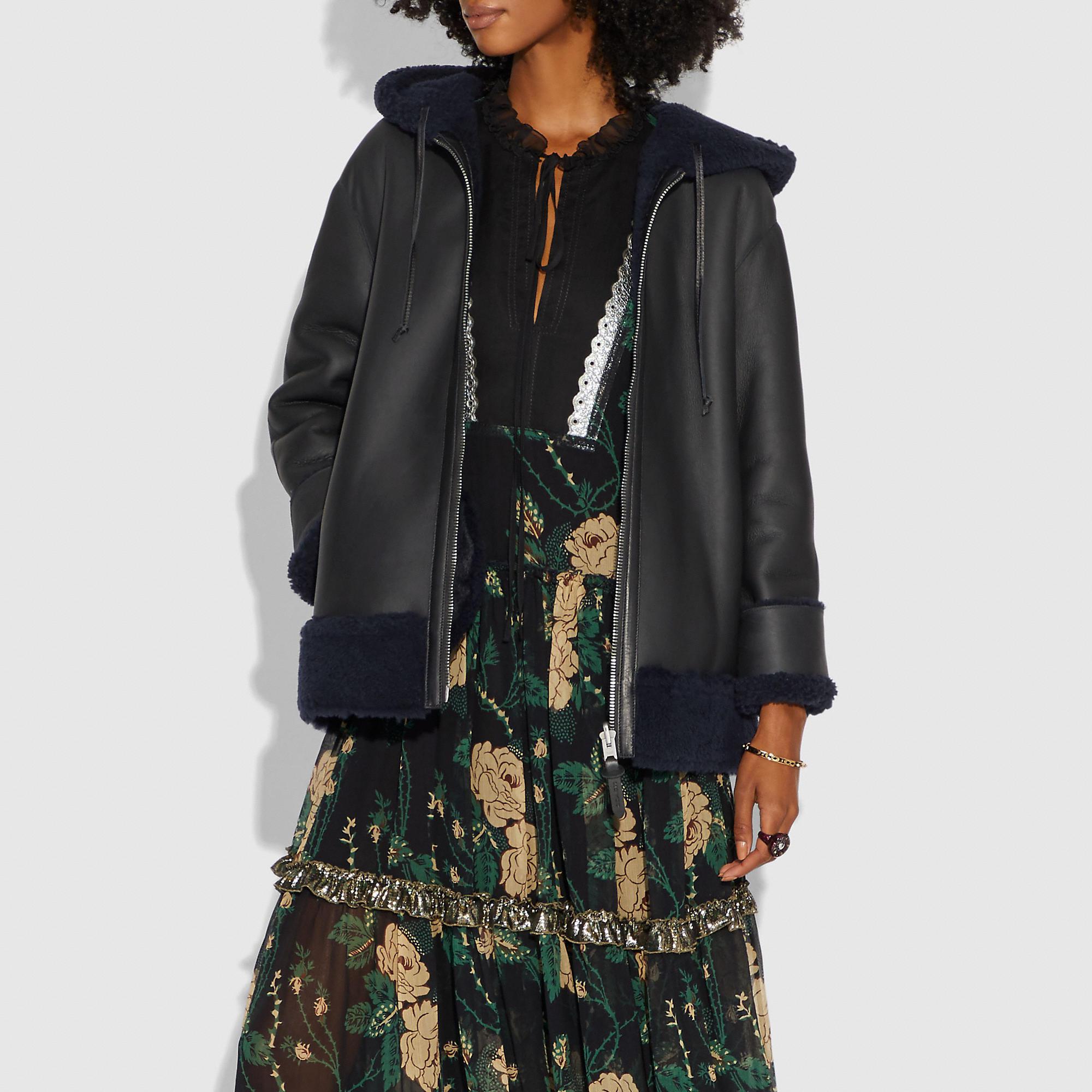 100% lamb shearling; 100% lamb leather. Zip closure. Reversible. Length: 27". This sporty staple is crafted of lightweight, soft shearling. It reverses to a buttery nappa finish, offering two looks in one.