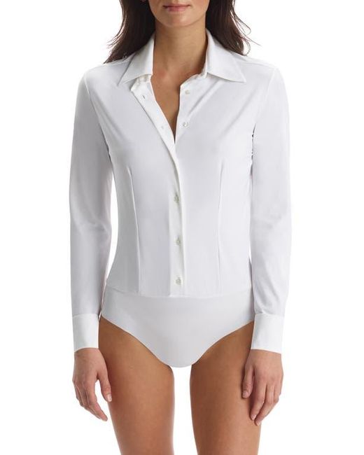 Women's White Classic Long Sleeve Button-Down Thong Bodysuit