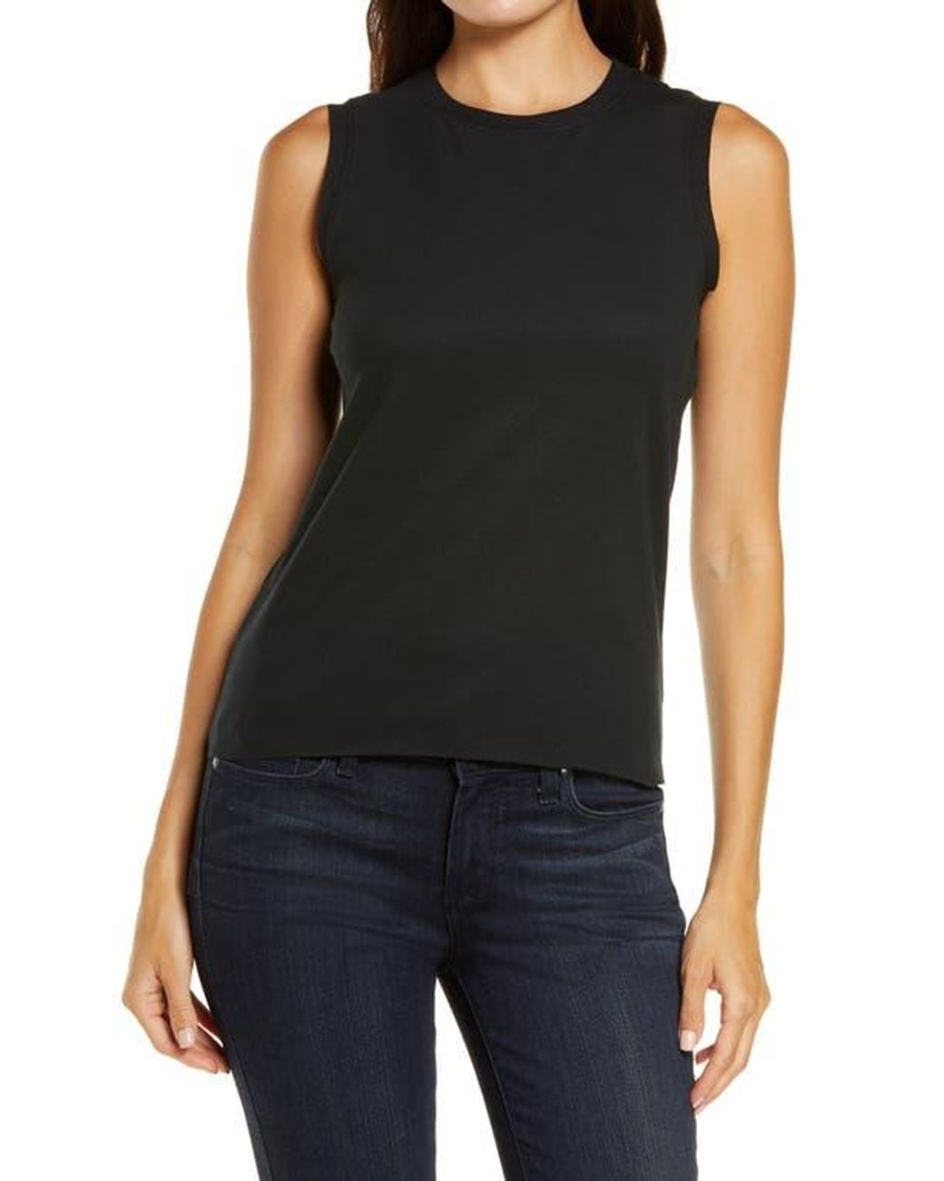 A soft, stretchy cotton blend brings superior comfort to a muscle tee that makes a great layering piece and looks sporty and workout ready on its own. 23" length (size Medium) Crewneck Sleeveless 80% cotton, 20% elastane Machine wash, line dry Made in the USA Lingerie Color: black