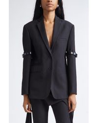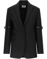 Go to Julian FashionLogo Belted' single-breasted blazer in cady fabric with front button closure, mirror lapels, breast pocket, patch pockets, structured shoulder strap, long sleeves with panel construction and leather belt detail with metal logo, back