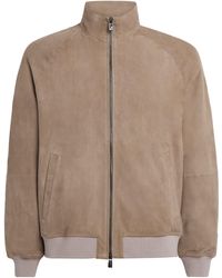 Go to BaltiniCenere GB has chosen this item for its high stylistic content and eco-sustainability. Corneliani Suede jacket. Origin: Italy. Features cognac brown front zipper closure two side pockets long sleeves ribbed finish Composition 100%