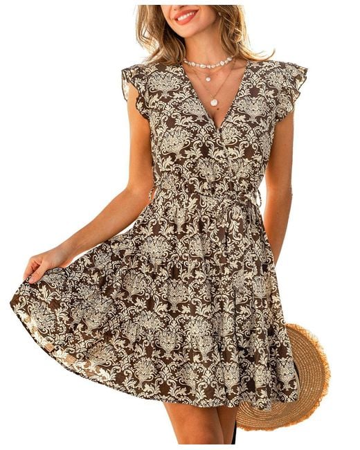 Women's Brown Surplice V-neck Short-sleeve Woven Mini Dress