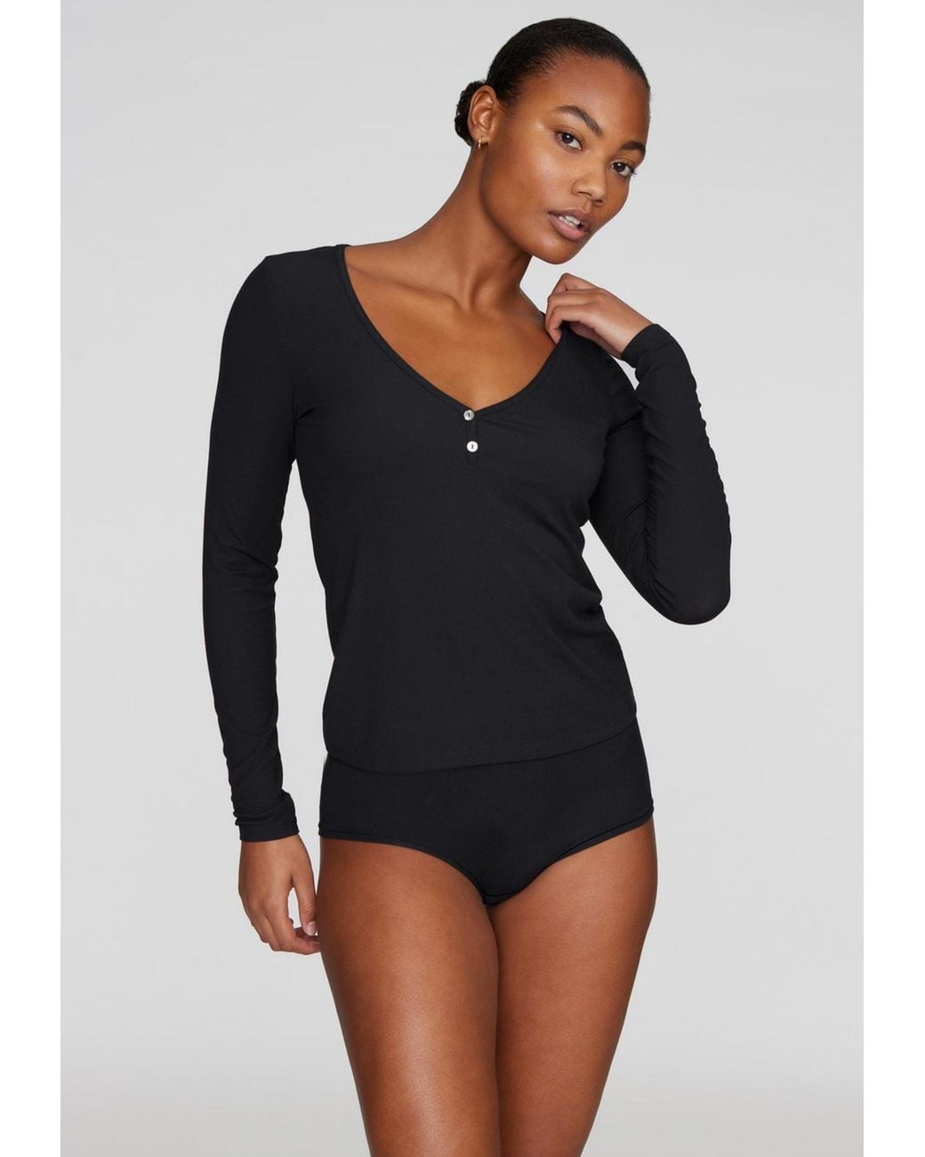 An elevated yet easy-to-wear long sleeve top that blends our incredibly soft and lightweight Modal Silk Rib with a figure flattering cut. A slim-fit, long sleeve top finished with mother-of-pearl faux buttons. Modal Silk Rib is incredibly soft with adaptable stretch and a lightweight luxe feel. A straight silhouette that hits at or near the hip. Neckline is designed to follow the deep V of the Plunge. Runs true to size if you're in between sizes and want a looser fit, consider sizing up85% Modal, 10% Spandex, 5% Silk. Machine wash delicate or hand wash warm. Do not bleach. Dry low heat. FKN-15919 - 2X2 Rib, 85% Modal, 5% Silk, 10% Spand. Color: blue