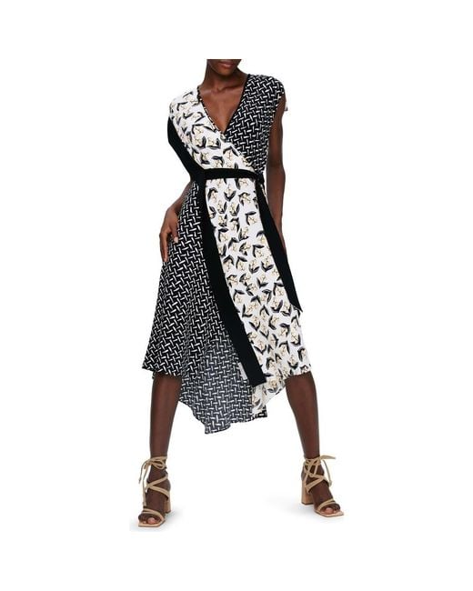 Women's Black Ellen Mixed Print Asymmetric Hem Wrap Dress