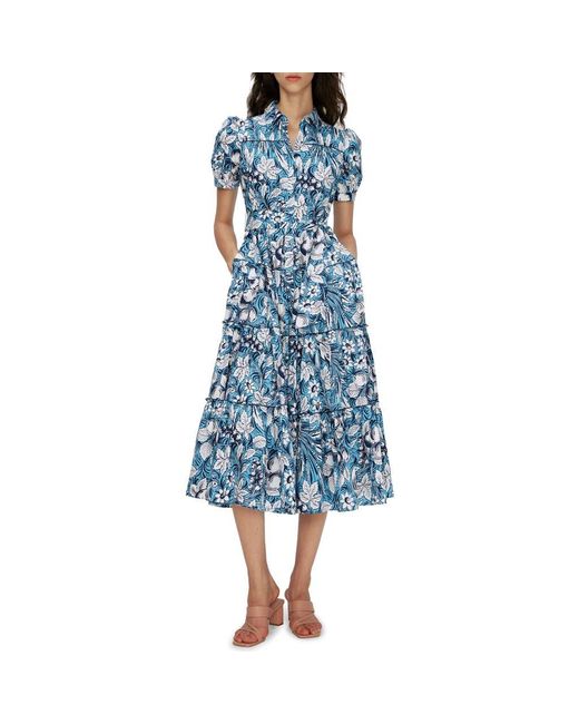 Women's Blue Queena Tie Belt Stretch Cotton Midi Dress
