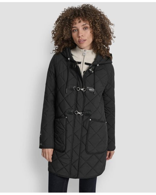 Quilted for extra texture and warmth, this mid-length hooded coat by Dkny will quickly become your go-to for everyday wear. 100% polyester; lining: 100% nylon; fill: 100% polyester. Color: black
