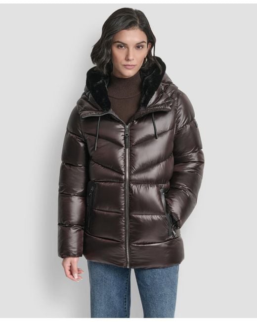 The zip front closure offers easy wear and a sleek, secure fit, while the attached hood provides added warmth. Shell & fill: 100% polyester; lining: 100% nylon. Color: brown