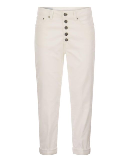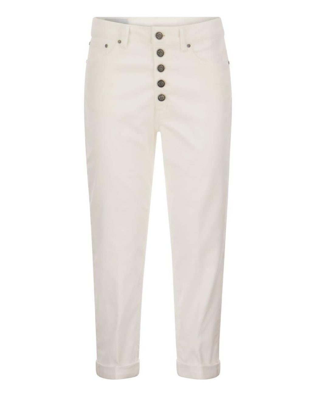 Koons five-pocket jeans with a loose fit, perfect for those who like to play with proportions and styles. The waist drops, the crotch is low and the leg is wide and straight. They are characterised by the multi-striped velvet. - regular waist, jewel buttons, ankle length - dondup logo designer id: dp268b vs0030y trt dd 017SpecificationValueSeasonCARRYOVERComposition62% COTTON, 36% LYOCELL, 2% ELASTANE LINING FOR POCKETS: 100% COTTONColorWHITEColor Code017Made InITALYISOITDepartmentWomenSectionCLOTHINGSubsectionPANTSSize InformationJEANSSize CodeJEANS