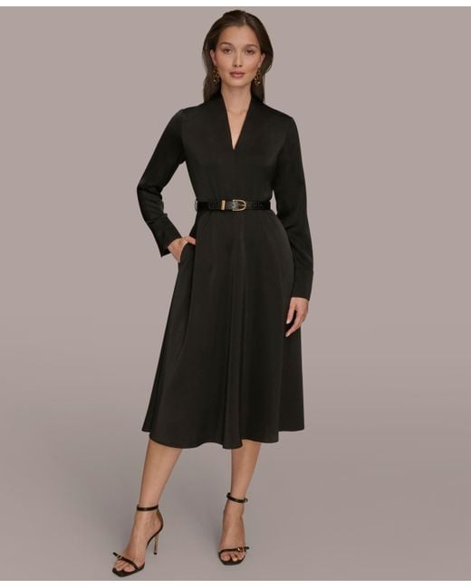 Women's Black Satin V-neck Belted A-line Midi Dress