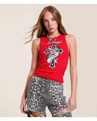 Go to Urban OutfittersEd Hardy graphic tank top made exclusively for UO. Cropped with a slim fit and a crew neckline. Graphics at the front and back. Find it only at UO. Features Graphic Ed Hardy