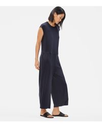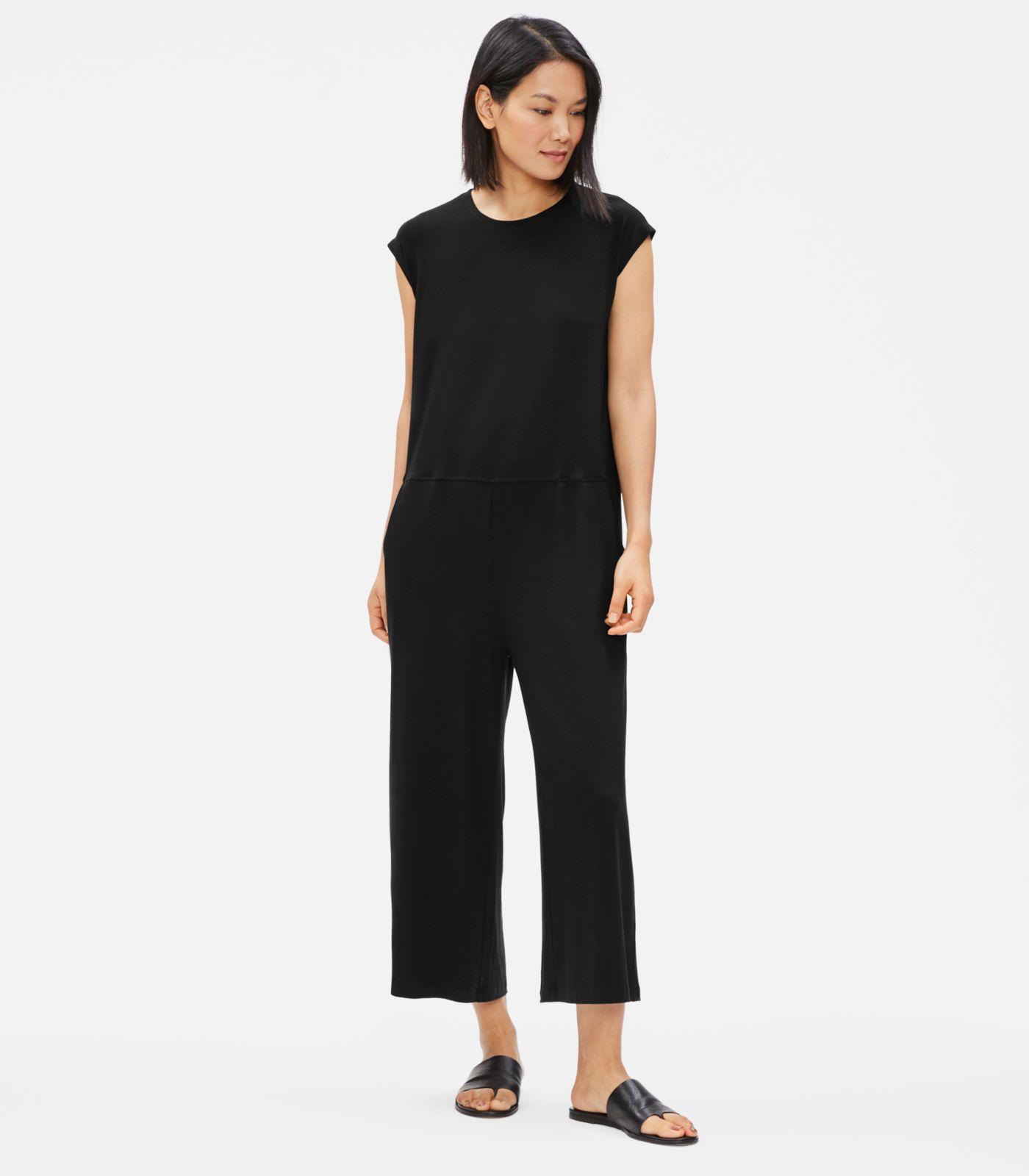 Easy and fluid, a wide-leg jumpsuit with a round neck and cap sleeves. An everyday shape you can dress up or down. In our polished and sustainable TM jersey. Designed with a fit that's slimmer through the hips, wider through the leg. Round neck, cap sleeves, waist seam, front pockets. Center back seam with concealed zipper. Ankle length with 22-inch inseam. Material: a fluid, body-skimming knit with polish that's right for any occasion. TM fiber is made from responsibly harvested trees. Knit and dyed in montreal. Cut and sewn in the us. This garment is responsible by design. That means it meets our highest standard for environmental or social impact. It reflects our efforts to take responsibility for what we make, always looking for more sustainable materials and methods. Model is 5'10" and wearing a size small, which measures 54 inches on the body. We recommend machine wash cold. May be dry cleaned. 93% /7% spandex. Usa: our factories. Today 97% of garments sold in the us are knit or sewn elsewhere; we produce 25% of ours in new york and california. Responsible fiber: ®. Starts with responsibly harvested trees. The fiber is produced with near zero waste--99.5% of all water and solvents are recycled. Safer for workers, better for the environment. Color: black