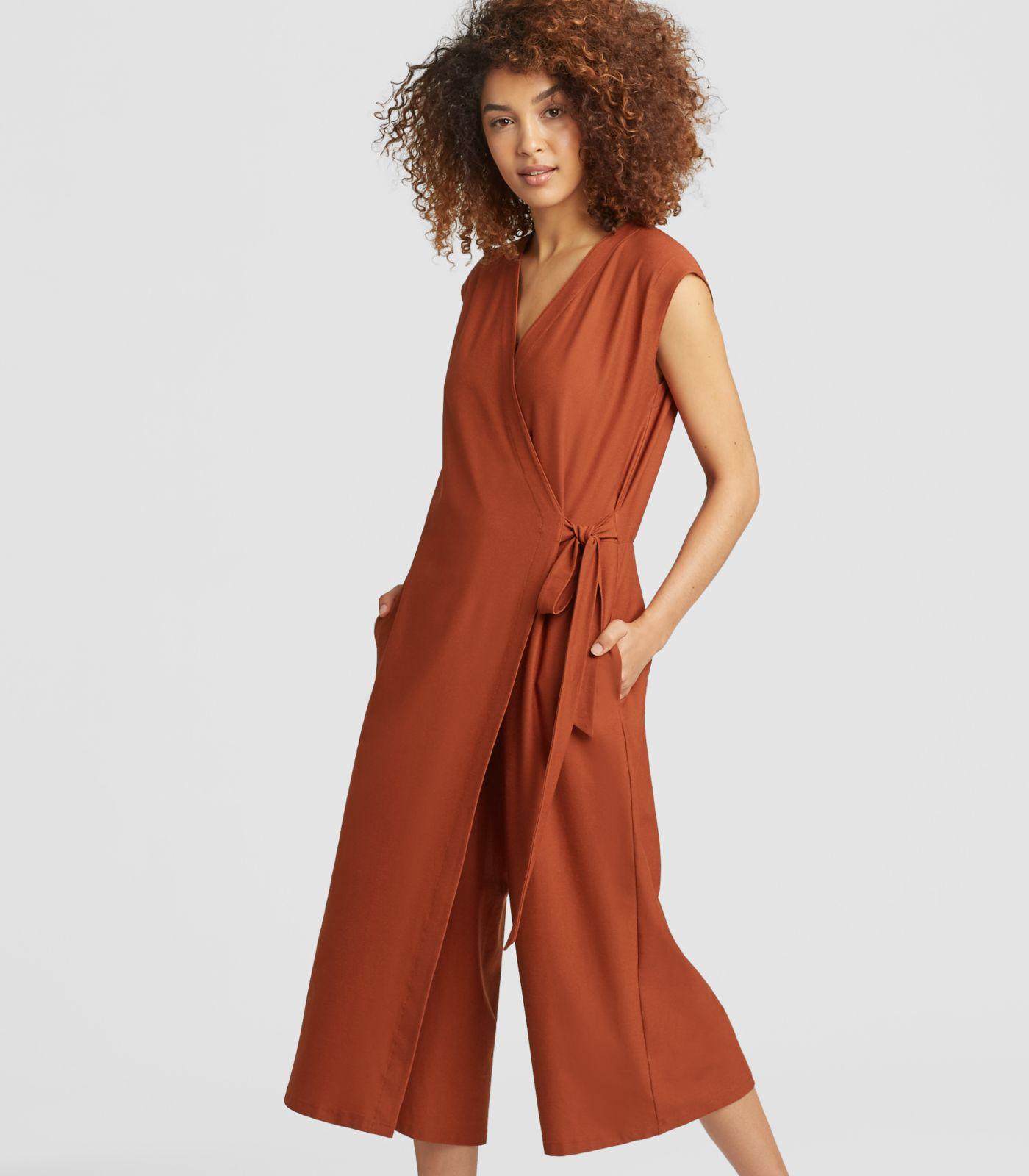 Go to Eileen FisherA jumpsuit with the look of a dress. Adjust the ties, enjoy the wide-legged ease. In our signature washable stretch crepe. Designed with a relaxed fit. Wrap front, v-neck, cropped wide leg, onseam pockets. 21-inch inseam (size small). Wrap front secured with interior and exterior ties. Back is shaped with elastic at the waist. Material: our signature lightweight washable stretch crepe: a textural knit with a unique combination of sophistication and stretch. Packs beautifully, goes everywhere. Knit and dyed in france, cut and sewn in nyc. 5'10" model is wearing a size small, which measures 35 inches on the body. We recommend machine wash cold. 66% viscose/27% nylon/7% spandex. Usa: our factories. Today 97% of garments sold in the us are knit or sewn elsewhere; we produce 25% of ours in new york and california.