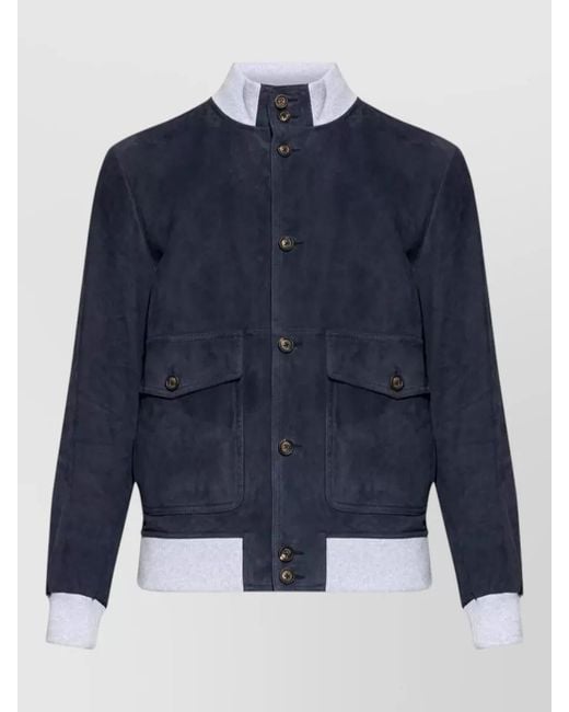 Men's Blue Leather Jacket Chest Pockets Front Ribbed Hem