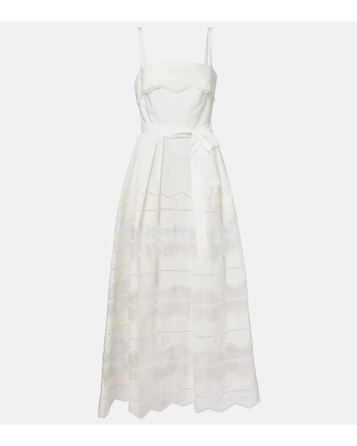 Women's White Belted Organza-Trimmed Cotton Maxi Dress