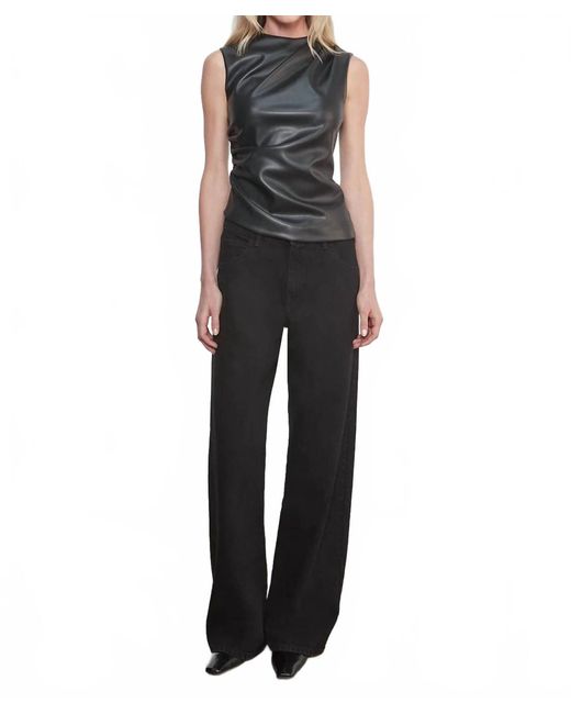 Pair this crop top with your favorite high-waisted jeans or maxi skirt.Meet the Leather Twist Top by Enza Costa, a striking piece that seamlessly blends luxury and elegance in timeless black. Designed with a sleeveless cut and a high crew neckline, this crop top features an intriguing asymmetric ruche detail in vegan leather. Crafted from 100% polyurethane with a polyester lining, it is proudly made in the USA and offers a clean back seam for a sleek silhouette. Closure - Zip closure. Care - Dry Color: black