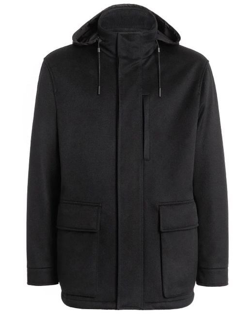 Black cashmere water-repellent padded design stand-up collar detachable hood drawstring hood chest welt pocket concealed front fastening two front flap pockets long sleeves straight hem Size: 46. Gender: Male. Material:Cashmere. Color: black