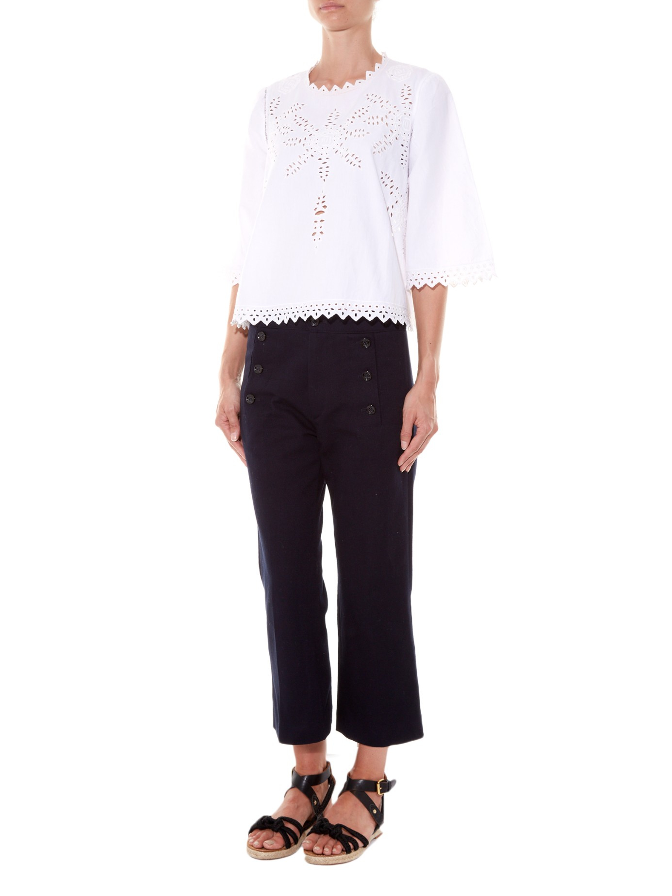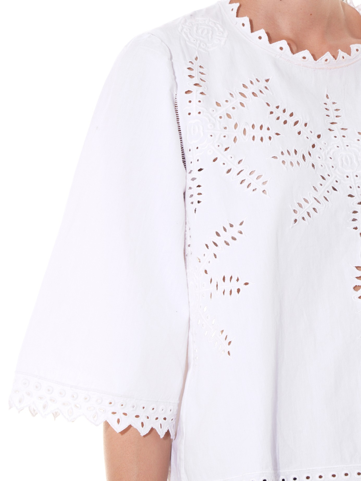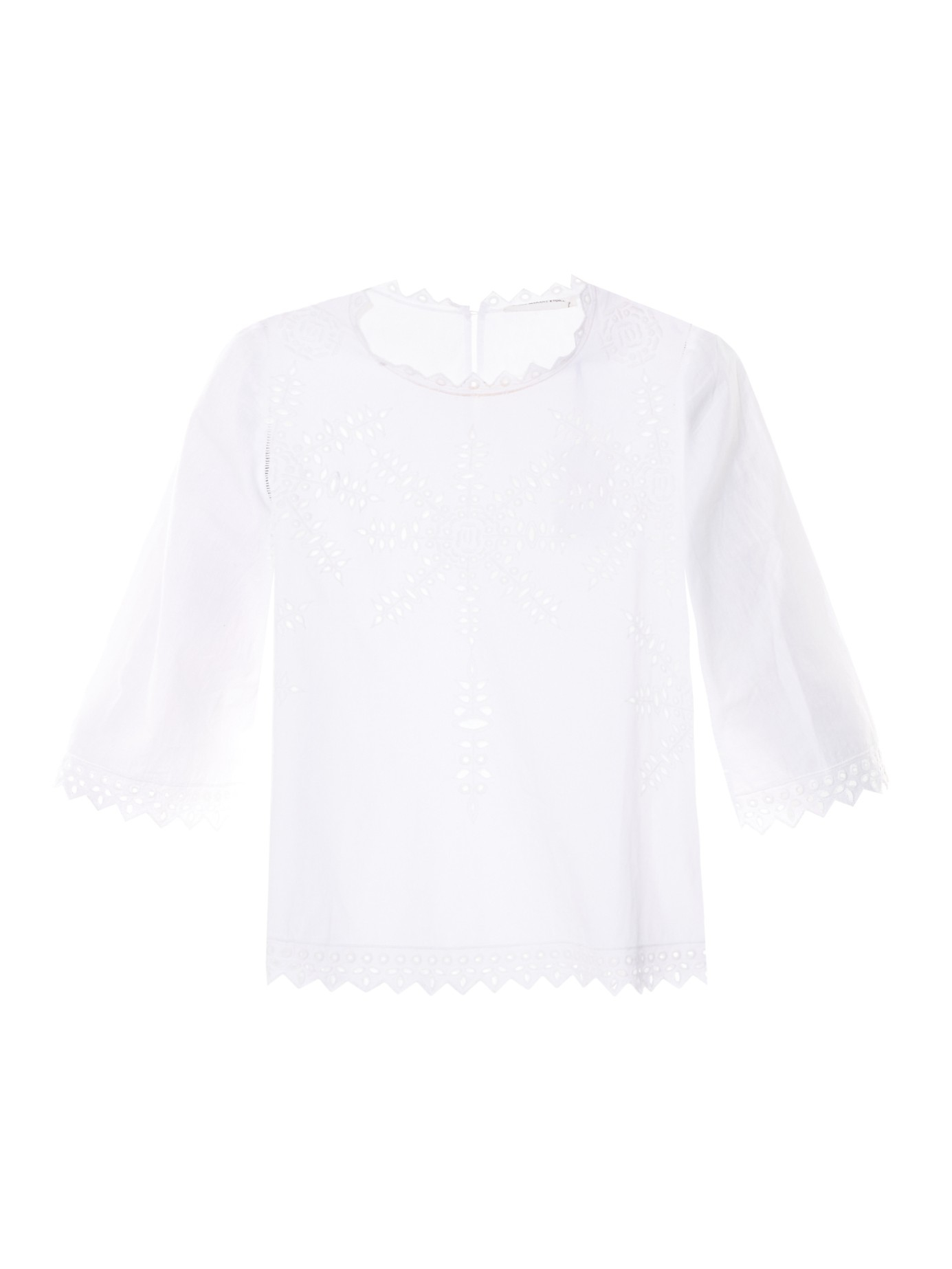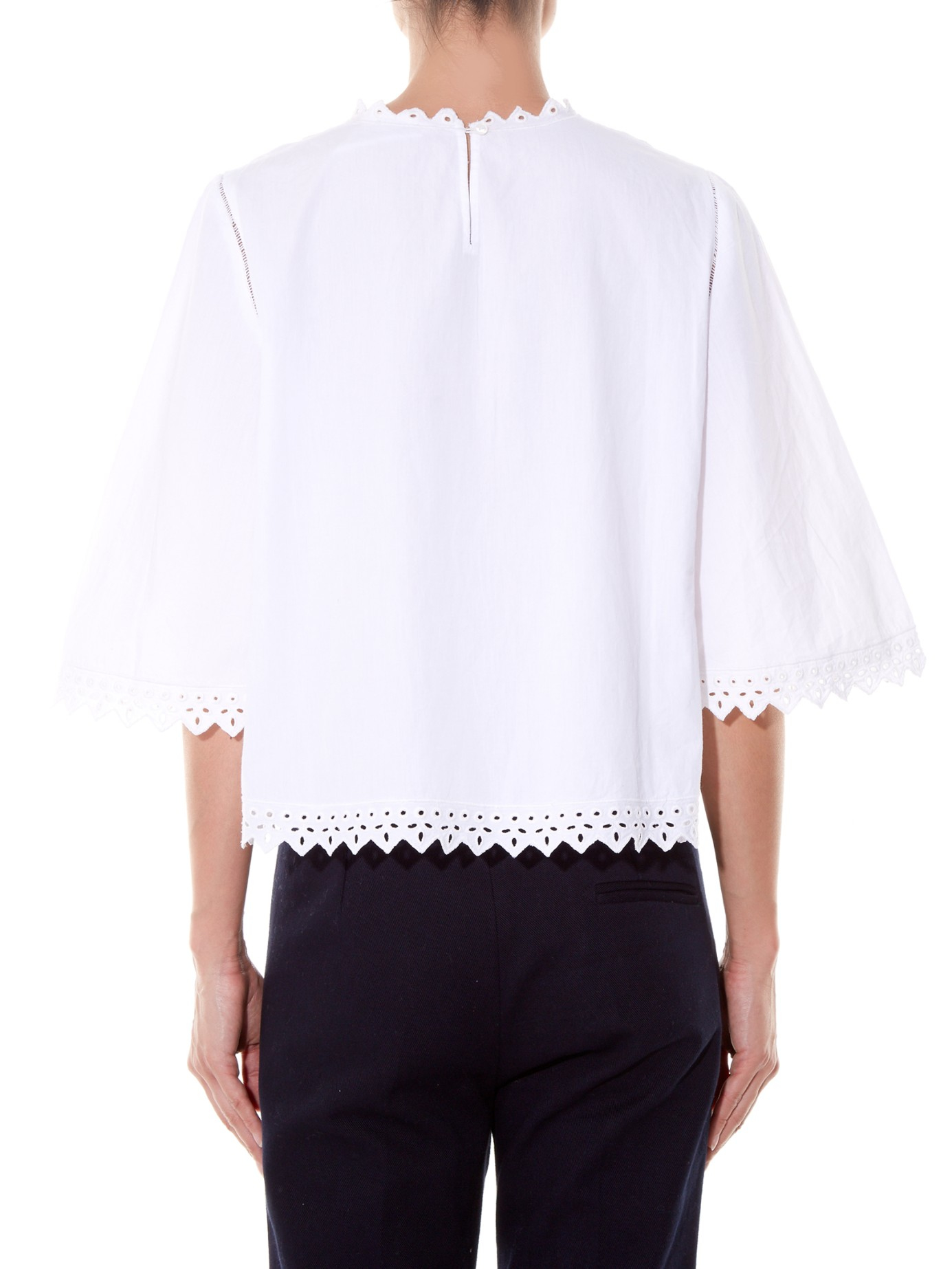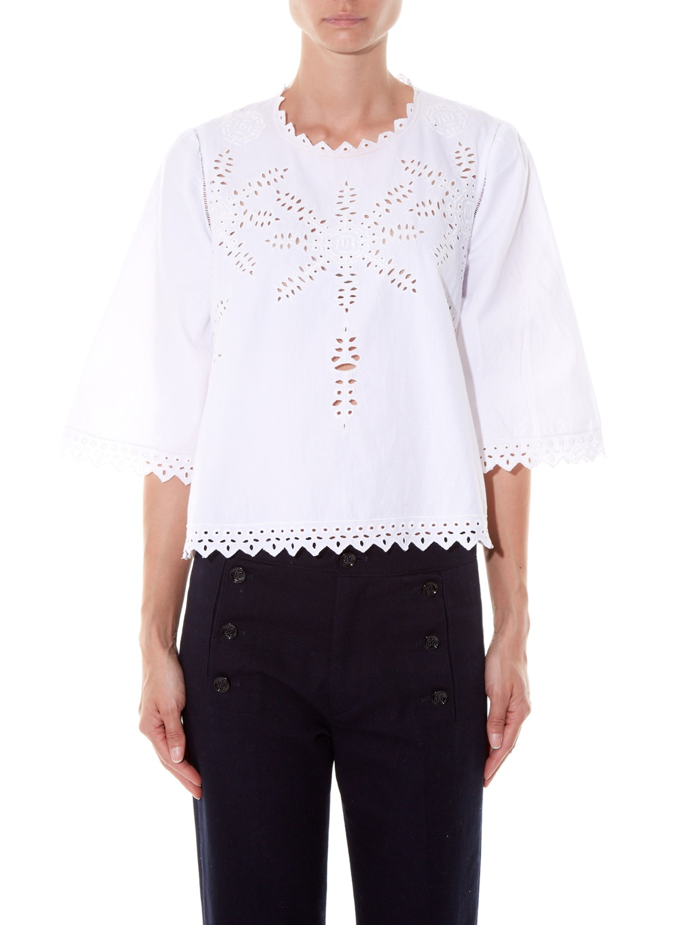 Go to MATCHESFASHIONNothing signifies the start of spring like a crisp white cotton-poplin top. Isabel Marant Étoile's Dill style is predictably pretty with cut-out embroidery and soft zigzag trims. Partner it with tailored navy pants and strappy leather sandals for a Gallic-inspired off-duty combination. White, cotton-poplin. Broderie anglaise front and sleeve panel detailing. Close-fitting round neck, half-length sleeves. Zig-zag neckline, hemline and cuff detailing. Centre-back top button fastening. 100% cotton. Hand wash. Fits true to size. Loose-fitting style. Color: white