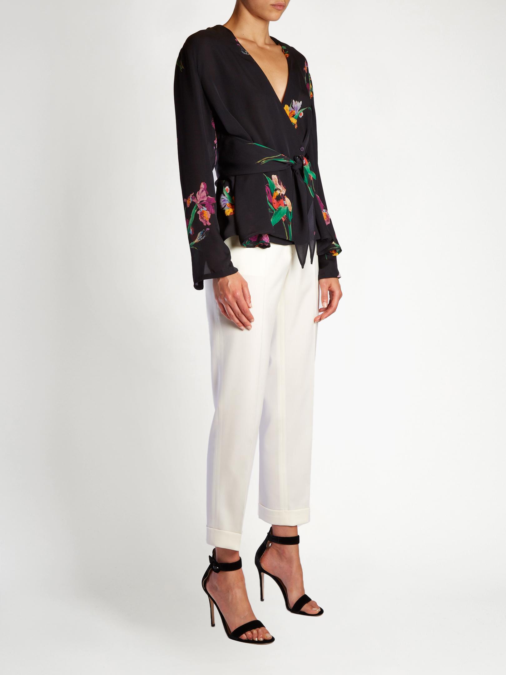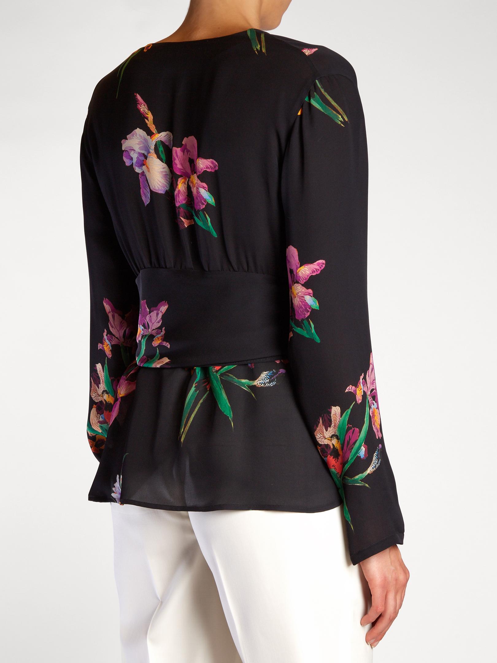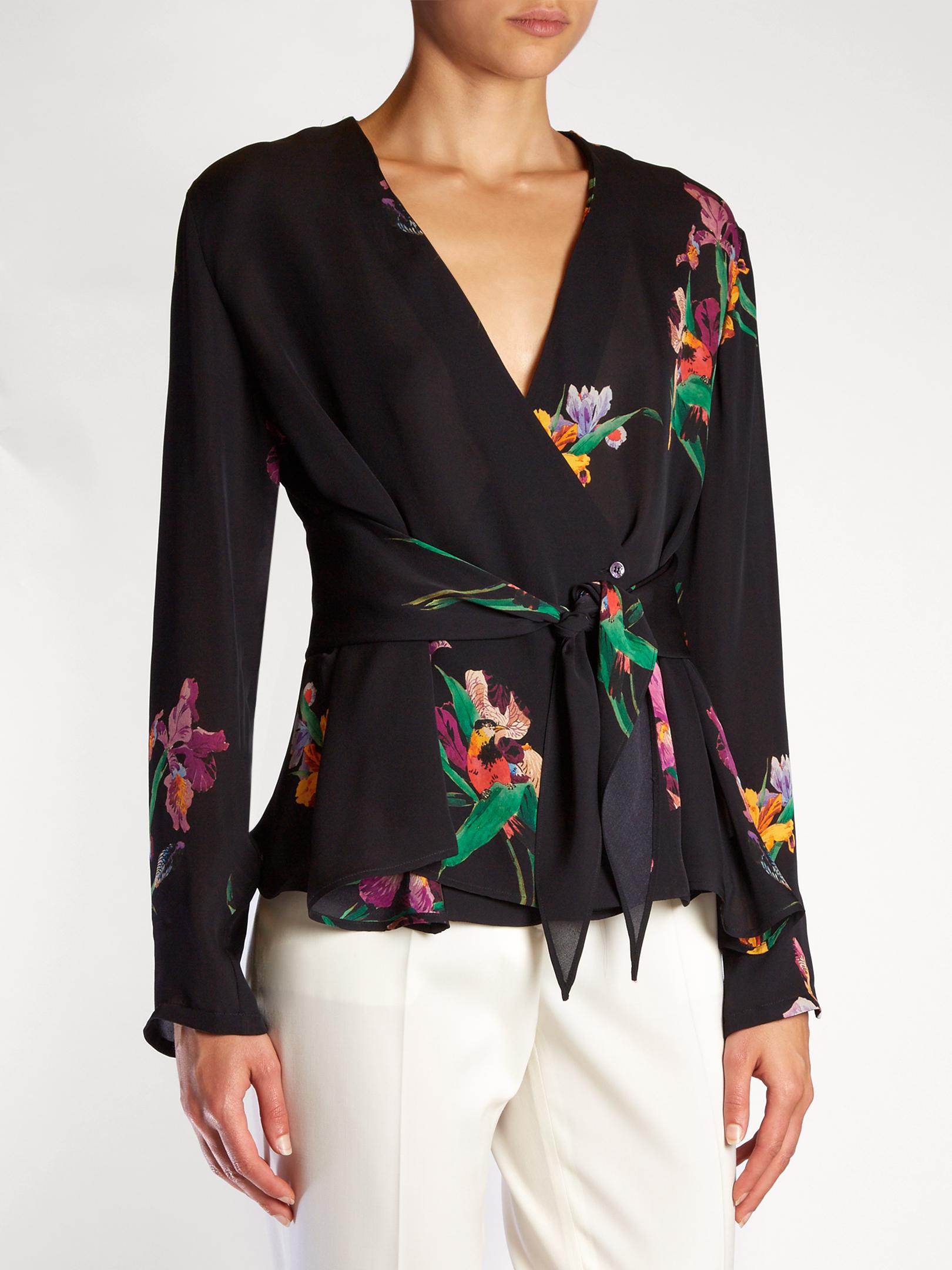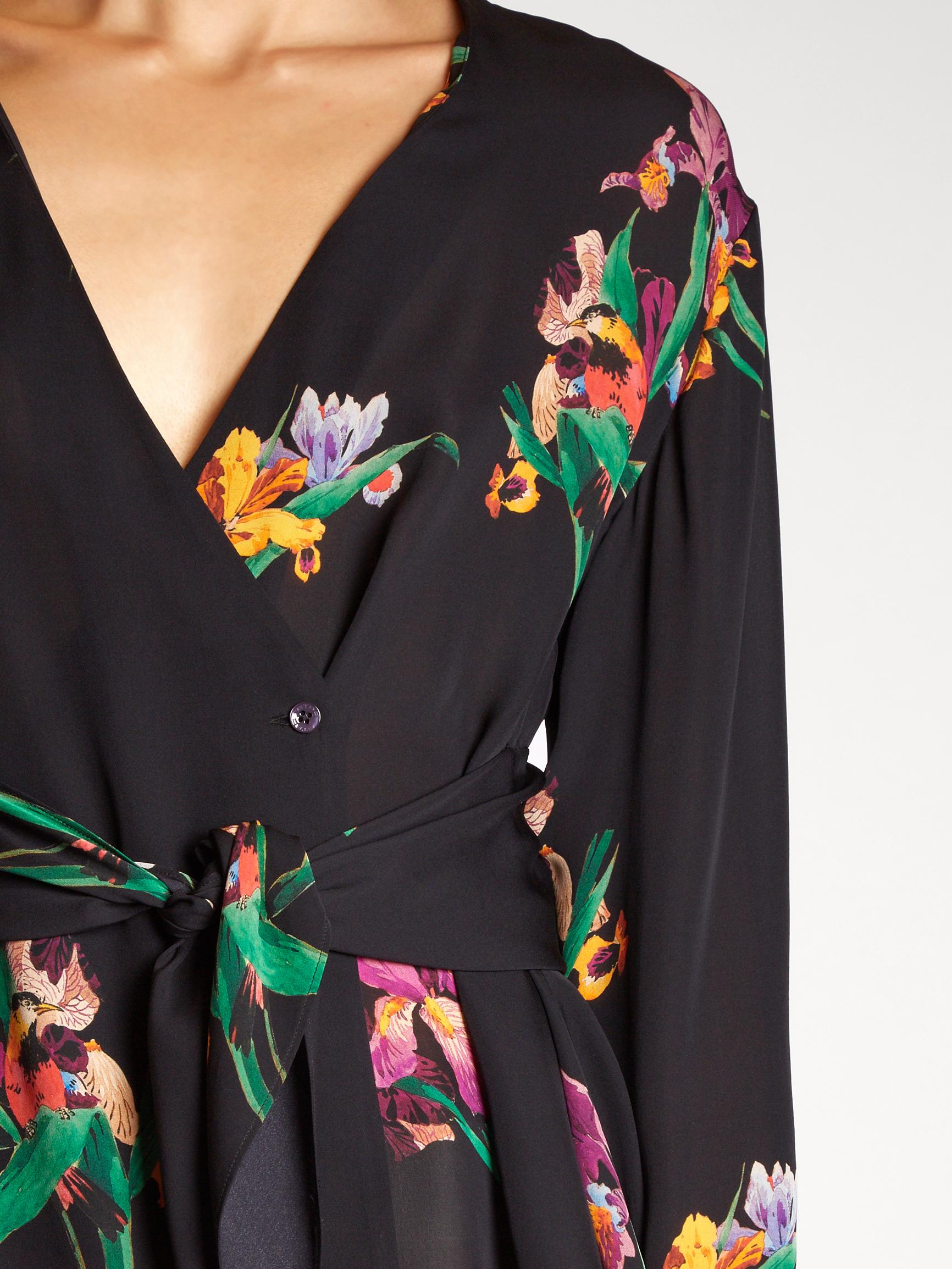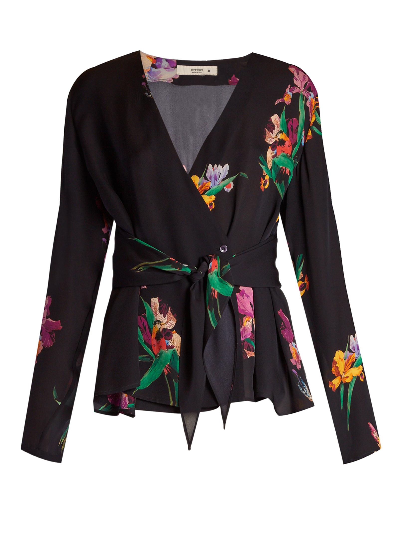 Go to MATCHESFASHIONFor an elevated take on daytime dressing, turn to Etro and this black wrap blouse. It's cut to softly skim the body, and is printed with painterly irises and tropical birds for an ultra-feminine feel. Cinch the waist with the accompanying sash, and add polish with sharp white pants. COMPOSITION: 100% silk. CARE: Dry clean. COUNTRY OF ORIGIN: Italy. Lightweight silk. Deep V-neck, long sleeves, slit cuffs. Tonal-purple, tonal-red and green iris and bird print. Wrap front, internal self-fastening ties and button fastening. Matching-print self-fastening waist ties. Slim fitting across the shoulder. Adjustable self-fastening waist tie, providing a personalised fit. Color: black