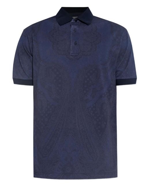 Cotton Piquet Polo Shirt With Paisley Print - Blue