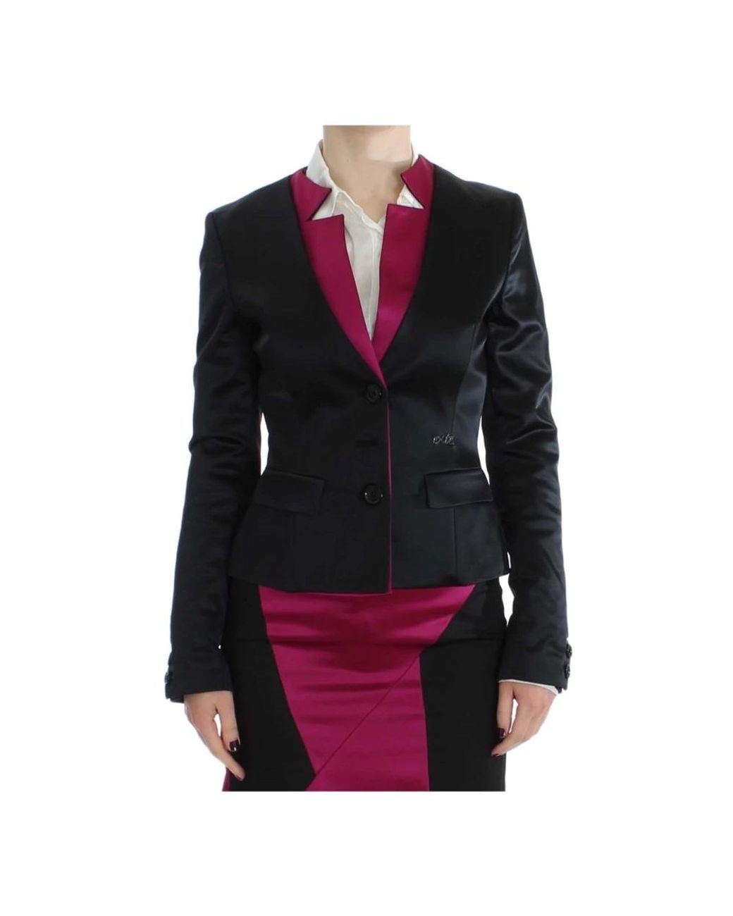 Elevate your wardrobe with this brand new Exte blazer for women. Crafted in Italy, this three-button single-breasted blazer features a stylish black and pink color combination. Made from a luxurious blend of acetate, polyamide, and elastane, with a viscose and polyester lining. Perfect for adding a touch of sophistication to any outfit.