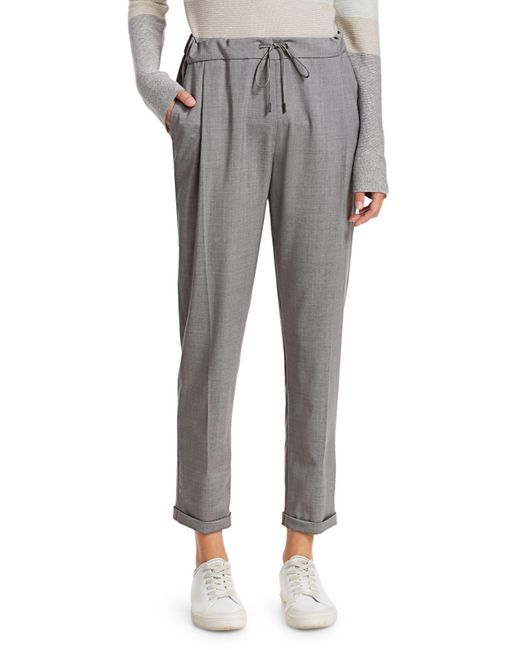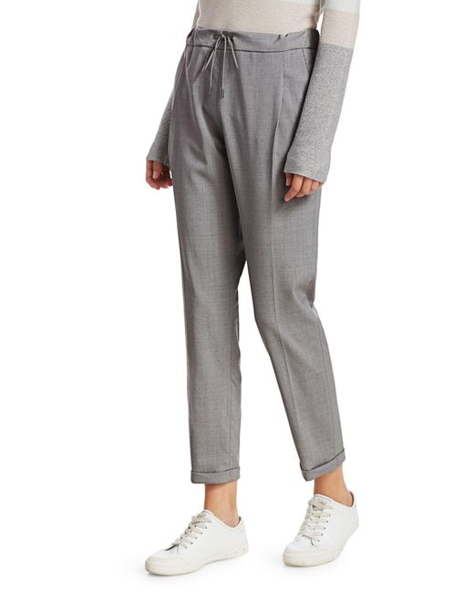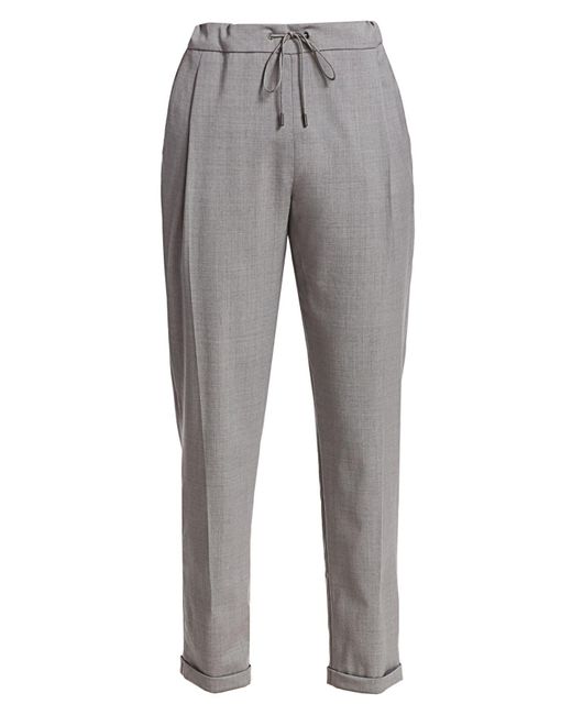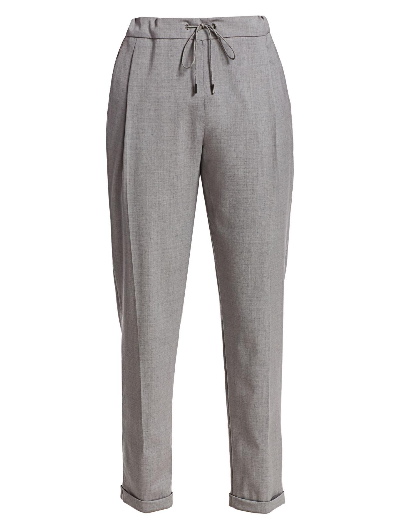 Crafted in lightweight virgin wool, these contemporary pants are finished with a jogger-inspired drawstring design that lends a sporty feel. Drawstring waistband; Side slip pockets; Tapered leg; Rolled cuffs; Trim: Eco brass; Stretch lining; Virgin wool; Dry clean; Made in Italy; Rise, about 11"; Inseam, about 37"; Model shown is 5'10" (177cm) wearing a US size 4. Color: gray