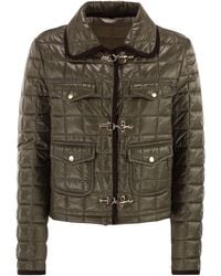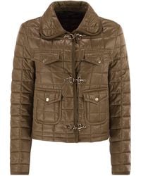 Go to FashdesA feminine interpretation that draws on the brand's heritage, the 3 ganci features an oversized collar and the unmistakable hook fastening reminiscent of workwear. This padded version is made from technical quilted fabric