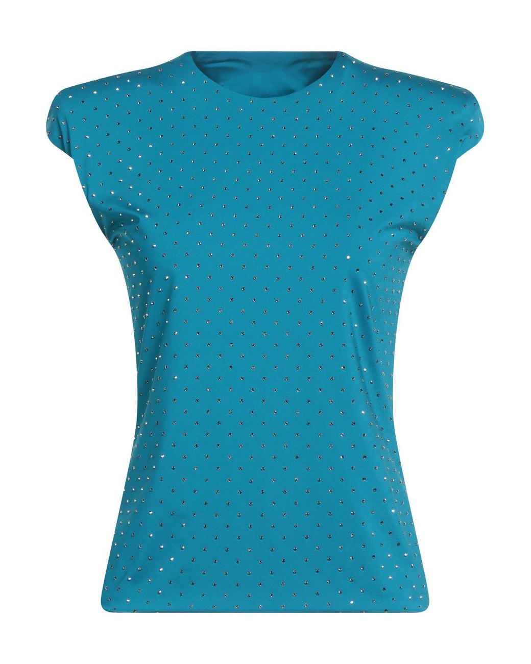 Top, jersey, solid color with appliqués, crystals, crewneck, short sleeves, stretch, hand wash or dry clean, do not bleach, do not tumble dry , Color: Turquoise , Size: S