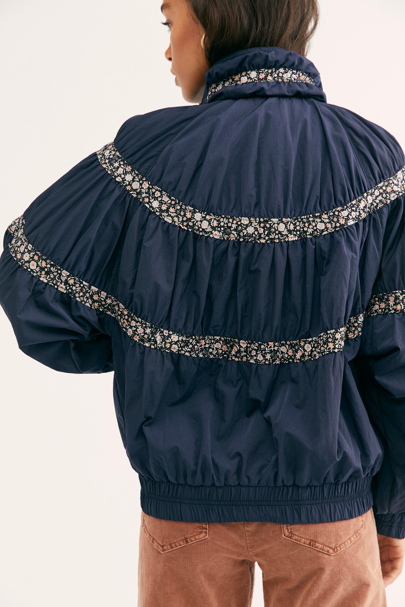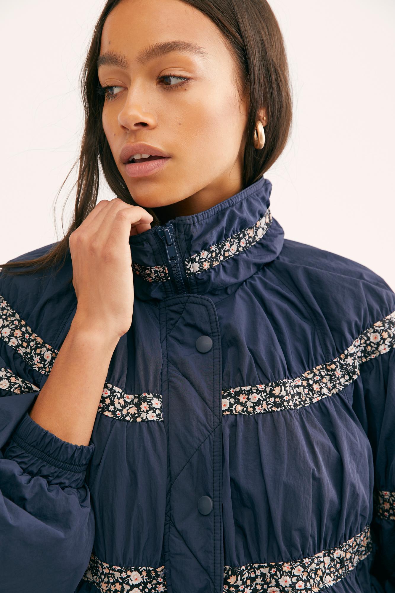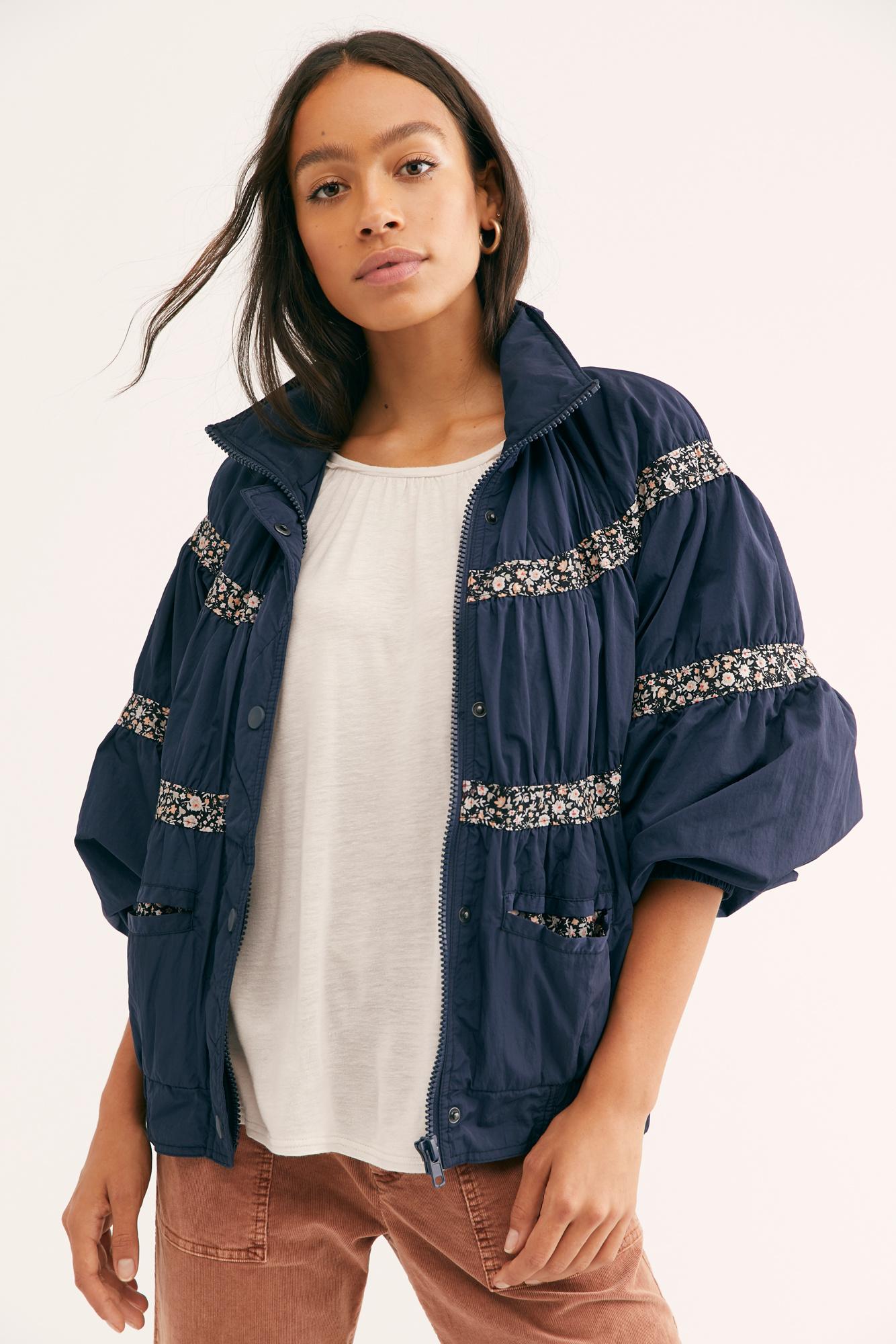 Go to Free PeopleRetro-inspired bomber style jacket from our we the free collection featuring gathered tiers with contrast floral print fabric and front pocket detail. Exaggerated dropped sleeves elastic band at bottom hem collar detail elastic banded cuffs. Lining: 100% Acetate,100% Nylon,Filling: 100% Polyester. Color: blue